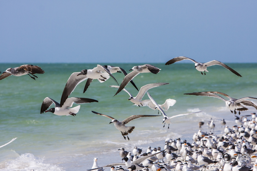 Aztekenmöwen (Leucophaeus atricilla) und Königsseeschwalben