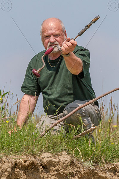 Ein Klassiker in der Ansitzfotografie ist der Ansitz in einer Bienenfresser Kolonie. Wenn man in südlichen Ländern wie z.B. Rumänien unterwegs ist findet man relativ schnell eine Sandwand mit einer Kolonie. Beim Beobachten der Vögel wird man sehen, das jeder Zweig oder jede Wurzel die an der Steilwand etwas herausschauen als Ansitz angenommen wird. Natürlich wird man hier auch Bilder machen. Es bietet sich aber an für die Vögel Sitzwarten anzubringen, die eine bessere Perspektive bieten. Wie die Sitzwarten dann angebracht werden wird jeder sebst nach seinen eigenen Wünschen entscheiden. Es kann ein Problem sein solche Sitzwarten in den Boden zu bekommen, da dieser oft sehr hart ist. Für solche Fälle habe ich mir eine alte Handkurbel mit Backenfutter angeschafft um dort einen Bohrer einzuspannen. Nun ist es kein Problem 25 Millimeter große Löchen in den Boden zu Bohren.