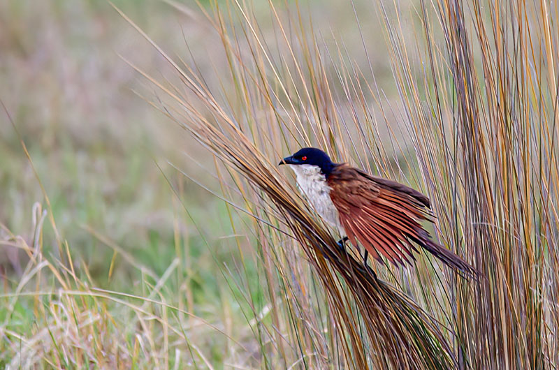 Wie ein stiller Beobachter sitzt der Spornkuckuck im Gebüsch der Wüstenkalahari von Botswana . Sein markantes Gefieder verschmilzt mit der Landschaft – ein Augenblick afrikanischer Wildnis voller Ruhe und Wachsamkeit
