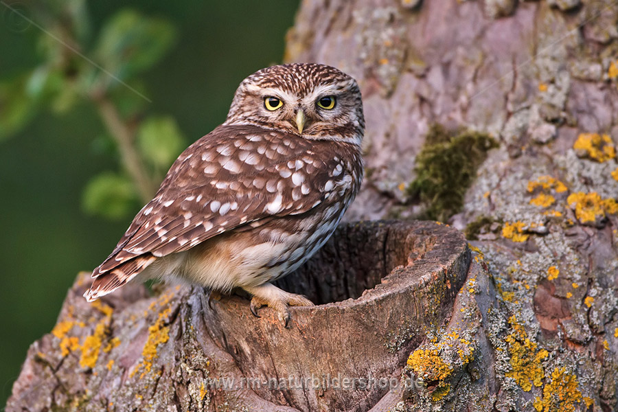 Steinkauz (Athene noctua) an seiner Höhle
