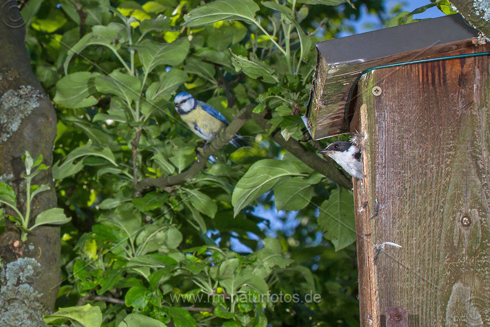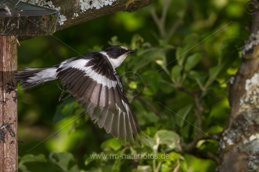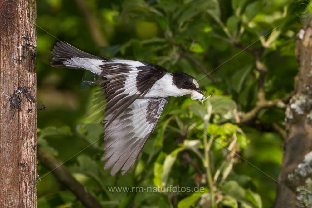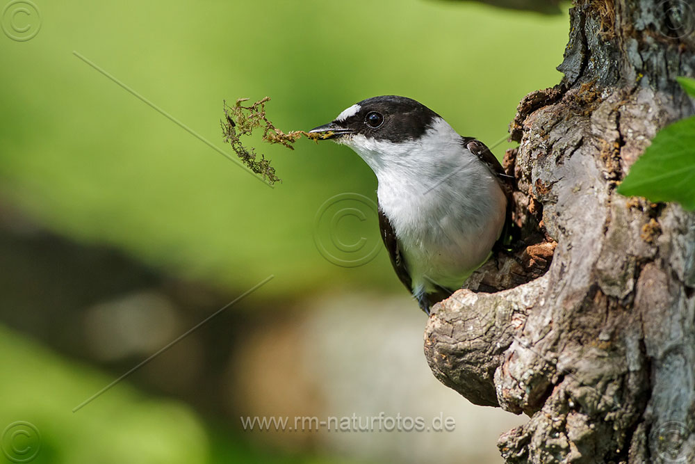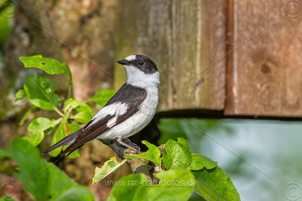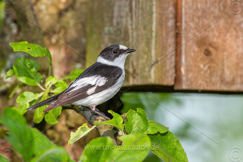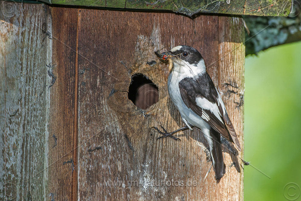 Halsbandschnäpper (Ficedula albicollis) Männchen an Nistkasten