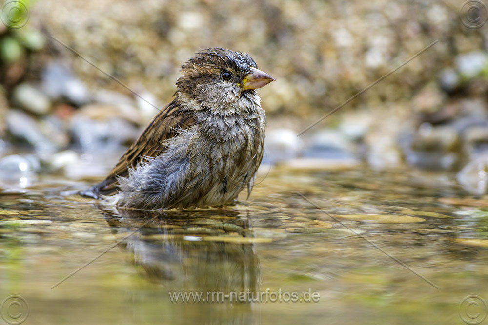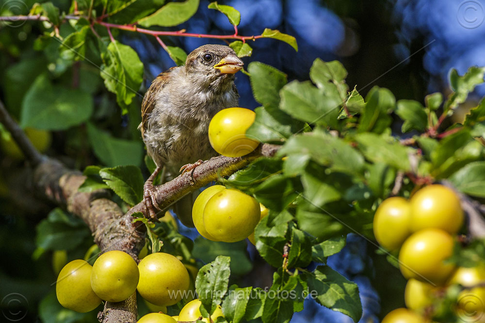 Haussperling (Passer domesticus) Weibchen frisst an Mirabelle