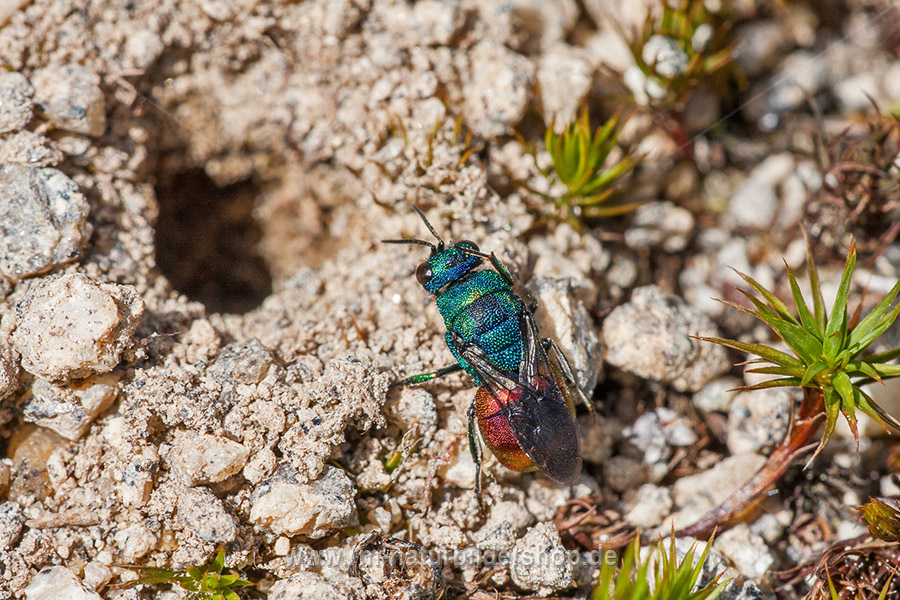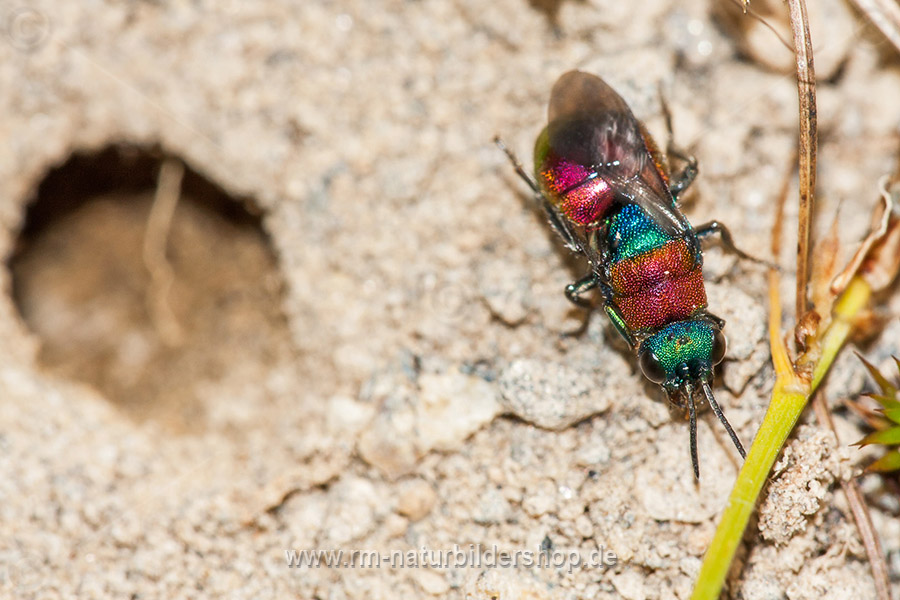 Sand-Goldwespe (Hedychrum nobile), an der Röhre der Sandknotenwespe