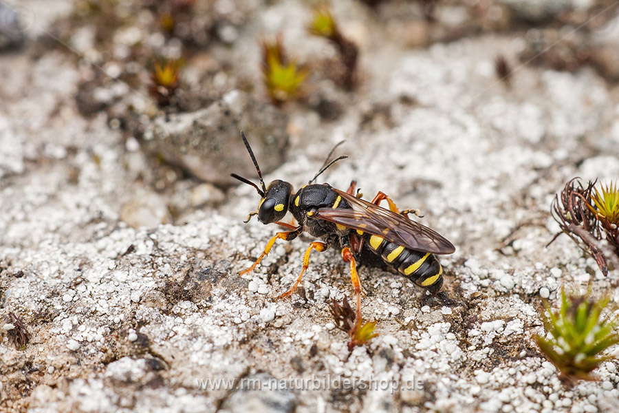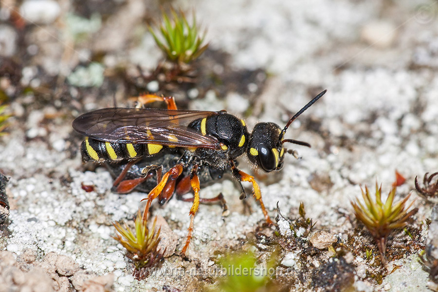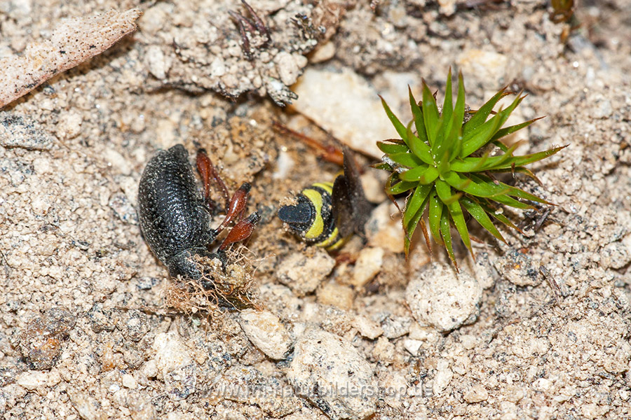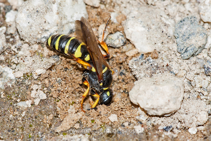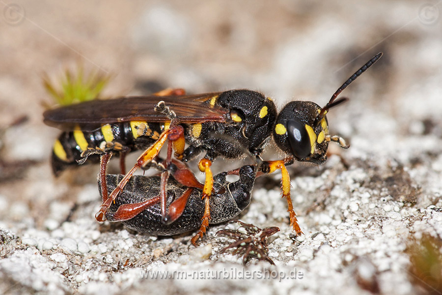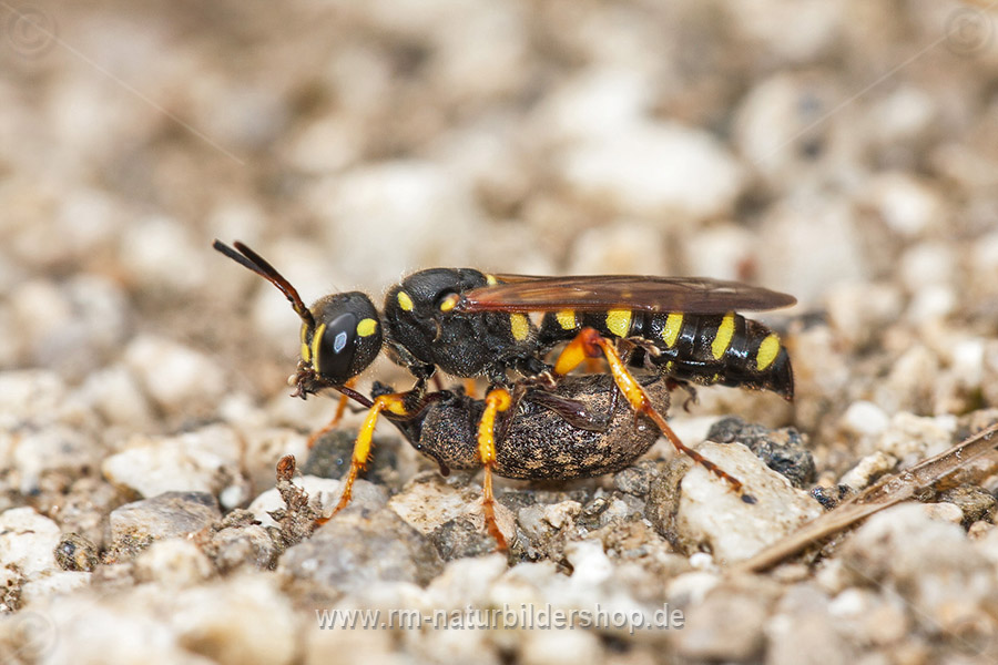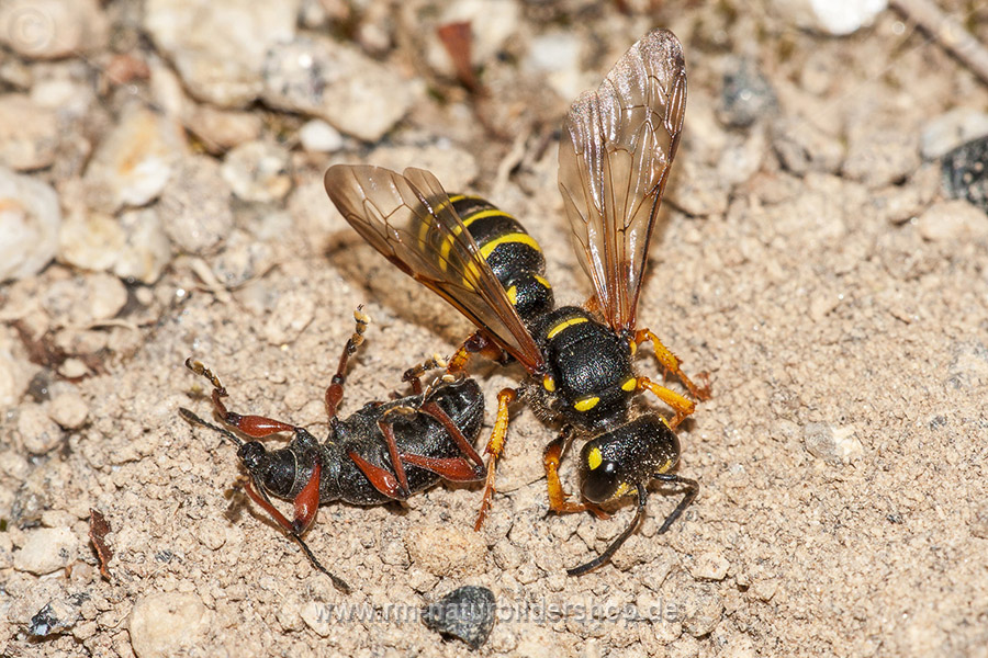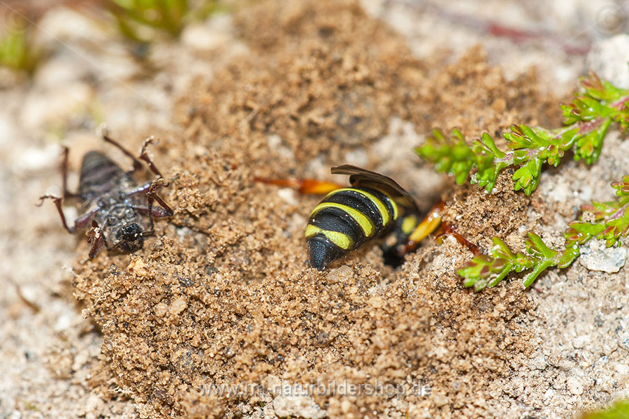 Sandknotenwespe (Cerceris arenaria) mit Rüsselkäfer als Beute