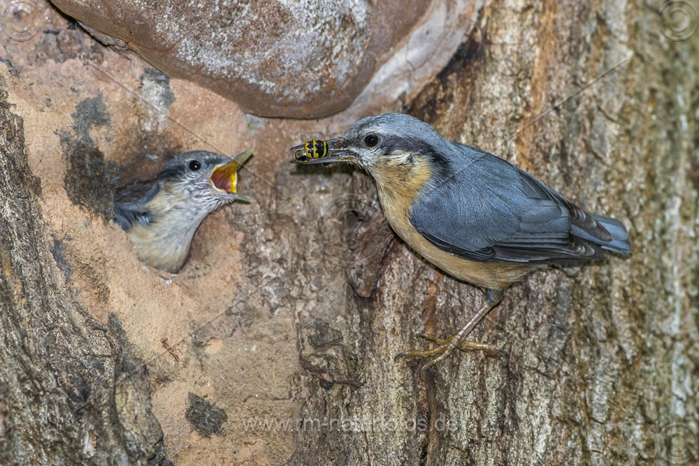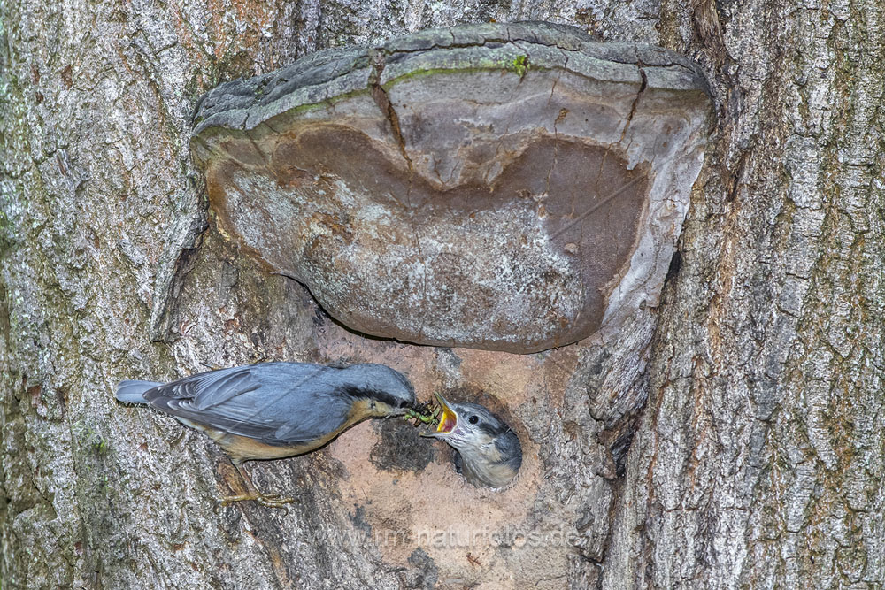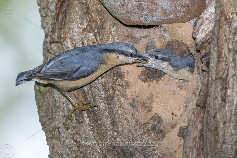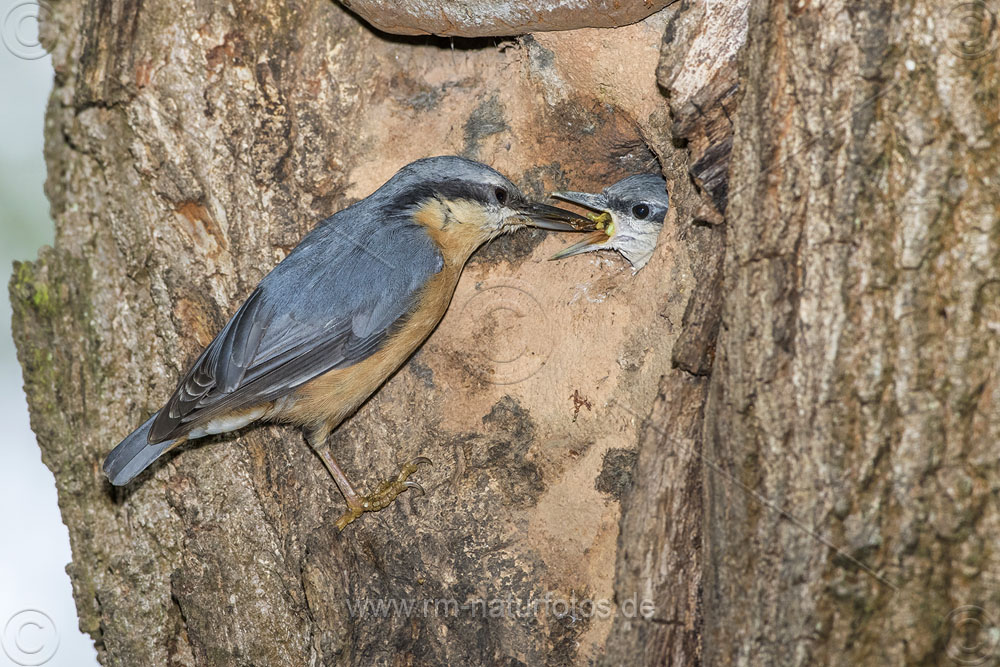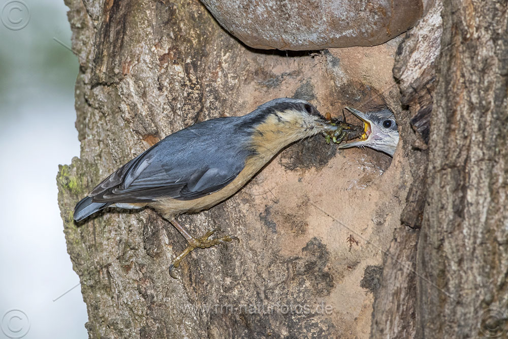 Kleiber (Sitta europaea) füttert Junge an der Höhle