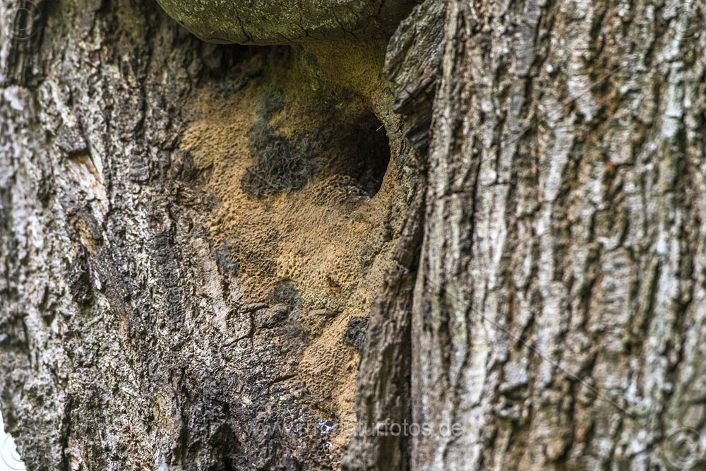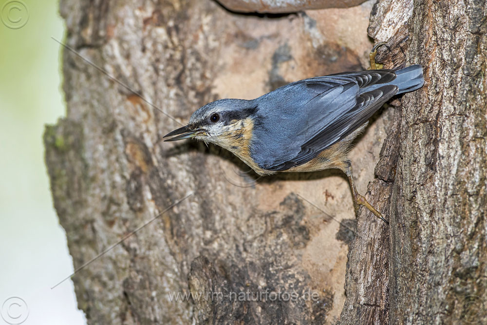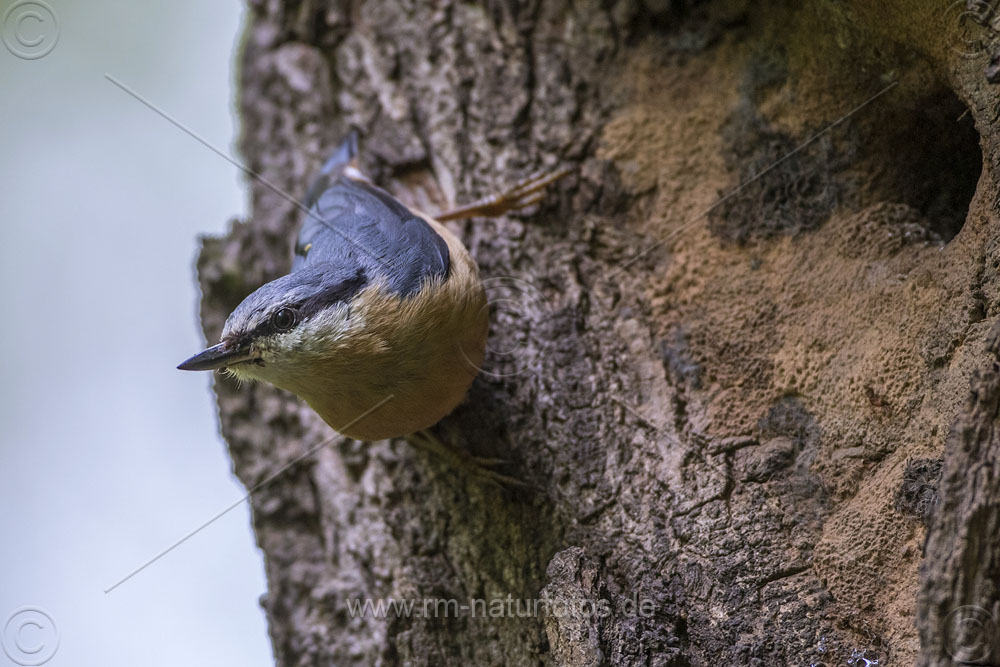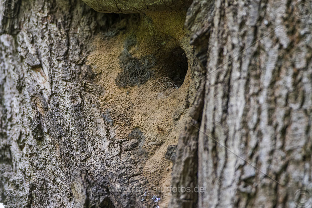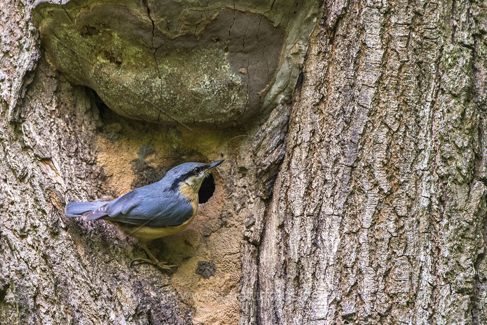 Kleiber (Sitta europaea) mit Lehm zugeklebte Höhle