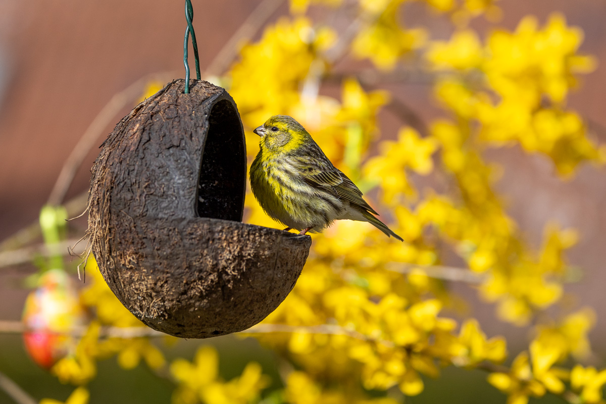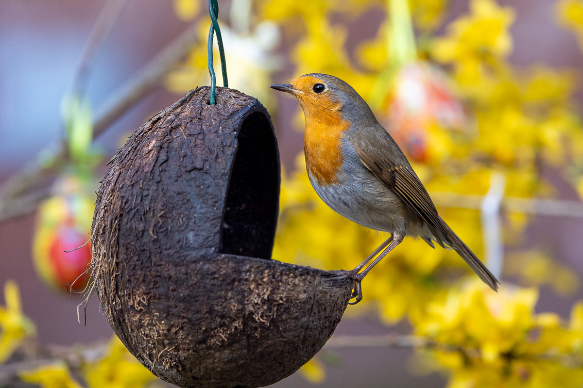 So langsam kommt die Natur in Schwung. Einige Zugvögel sind schon da und beleben den Garten. Am Vogelbad ist nach wie vor einiger Betrieb und die Umstellung auf Sommerfütterung wird auch noch gerne angenommen. Um etwas Osterstimmung zu erreichen wurde ein Forsythienzweig mit Ostereiern bestückt und im Hintergrund angebracht (Spielerei). An den Bächen kommen auch die Eisvögel in Stimmung, doch irgendwie ist alles etwas anders als in den vergangenen Jahren.