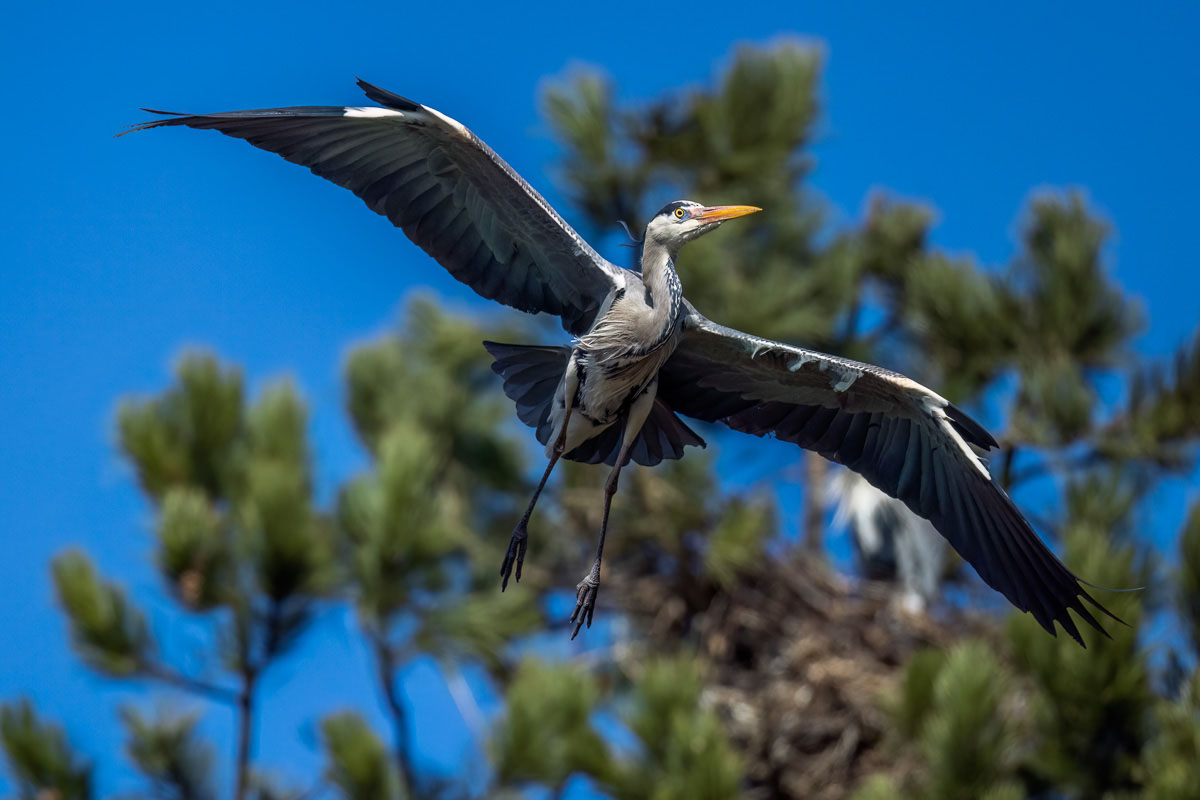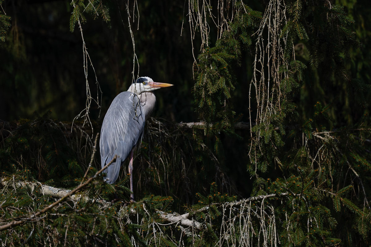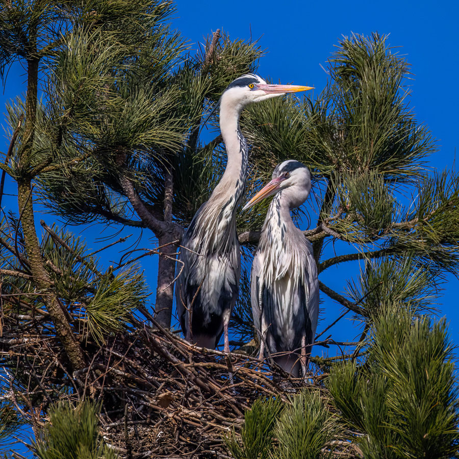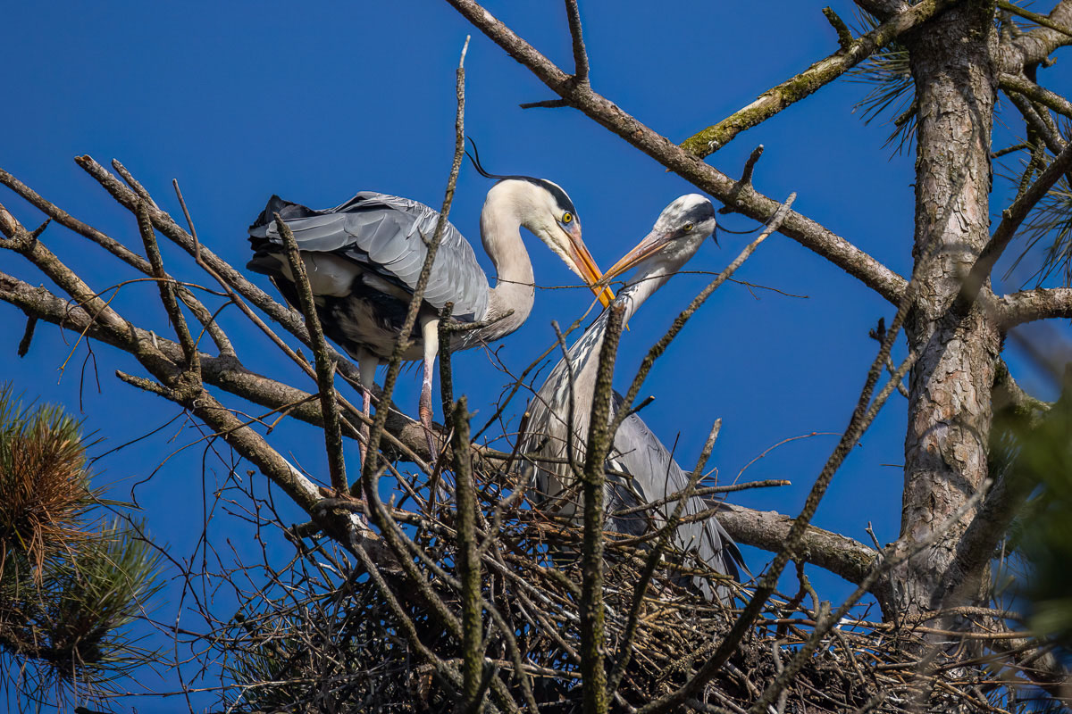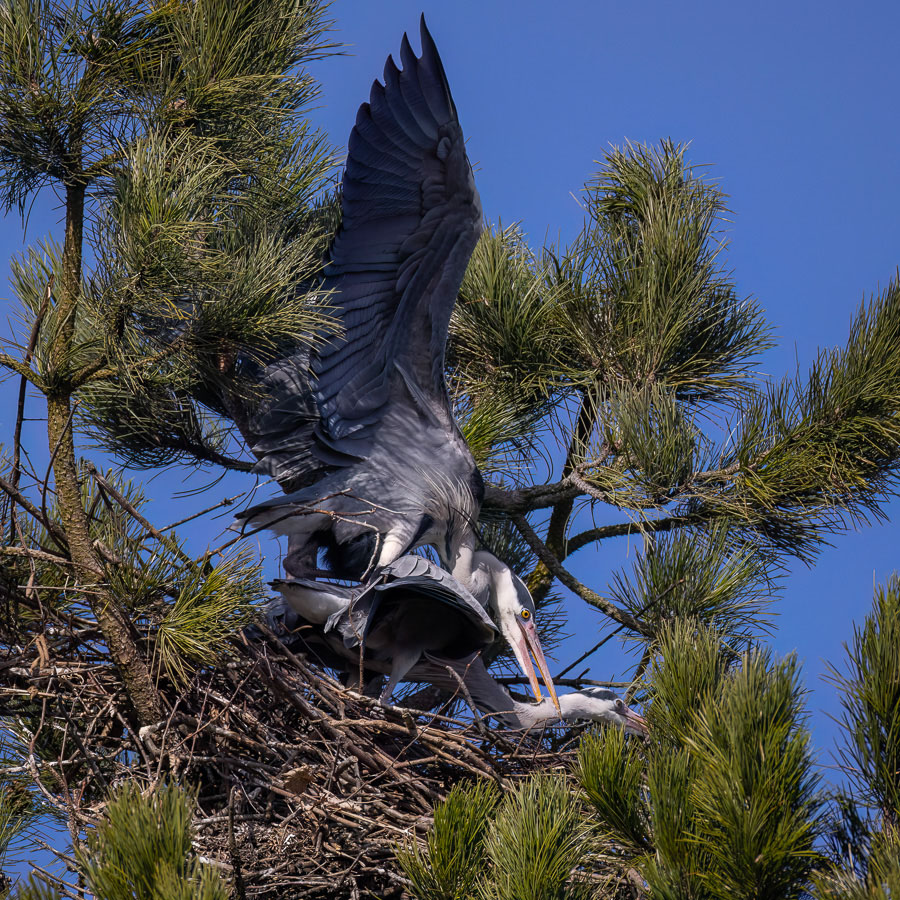 An den Seen beginnt es lebendig zu werden. Nilgänse streiten sich heftig. Graureiher haben ihre Nester vom Vorjahr aufgesucht. Im weiten Umkreis kenne ich nur eine Stelle an denen Graureiher Bodennester bauen. Leider ca. 100-130 Meter entfern vom Ufer. Doch hin und wieder gelingen einige Aufnahmen.