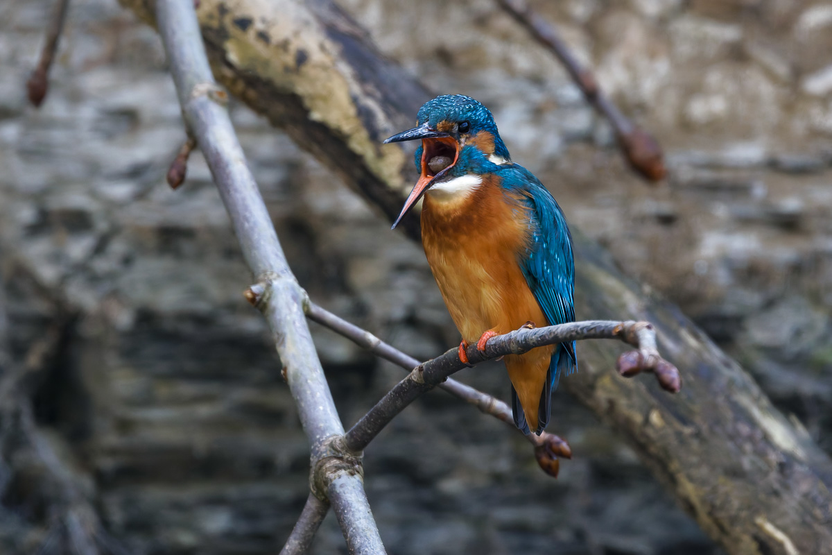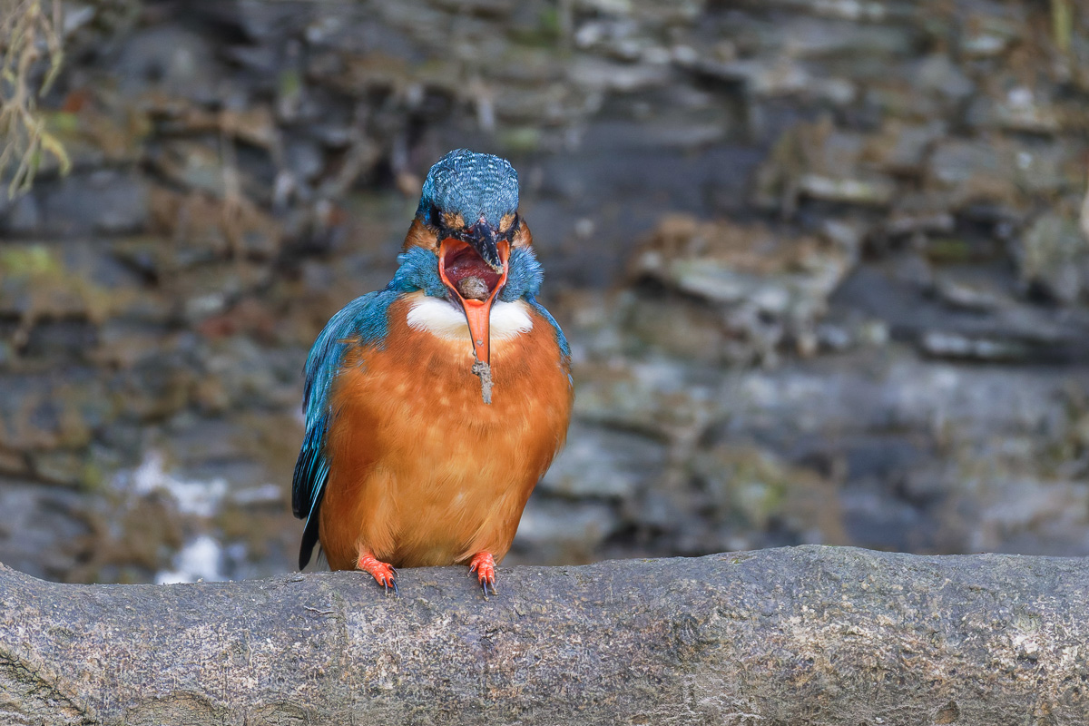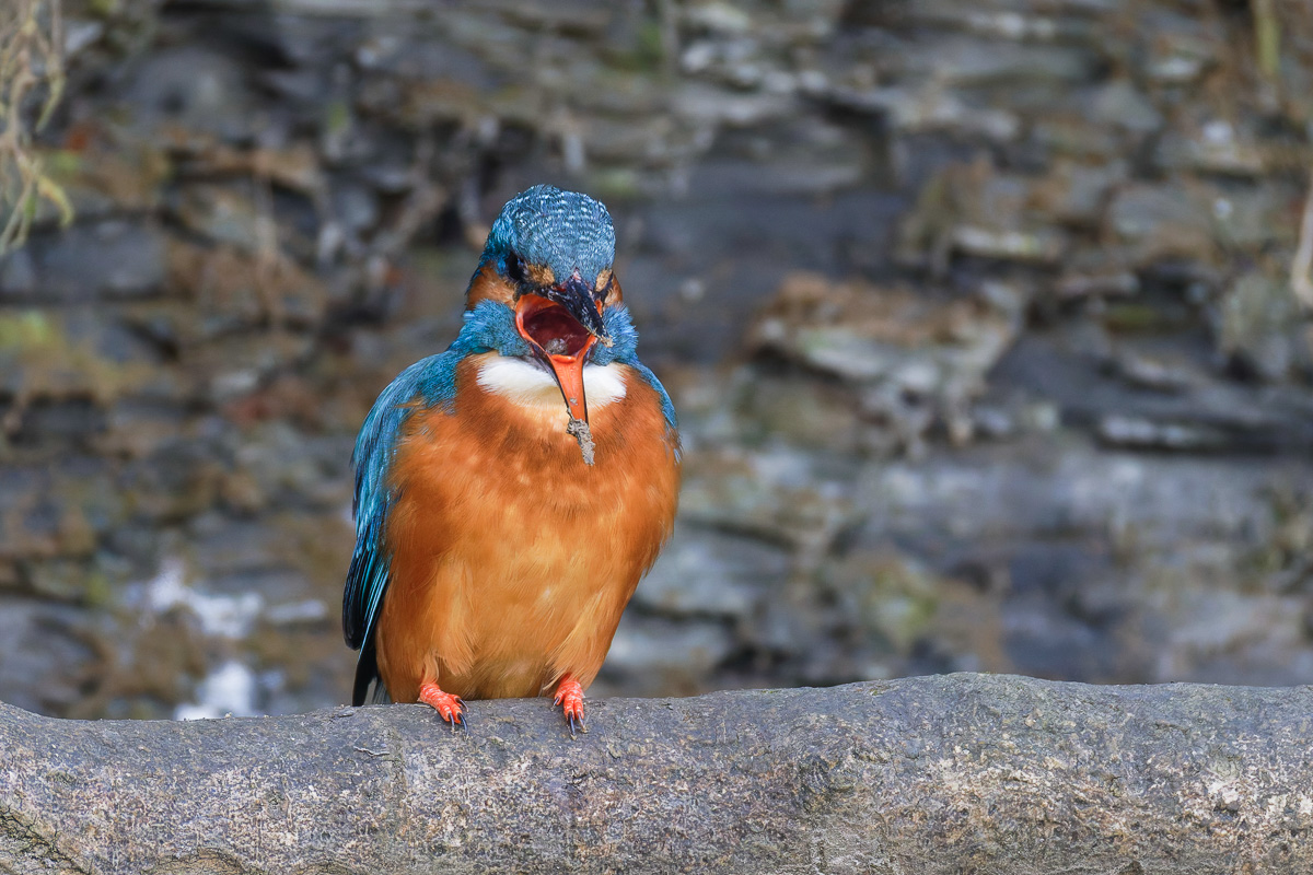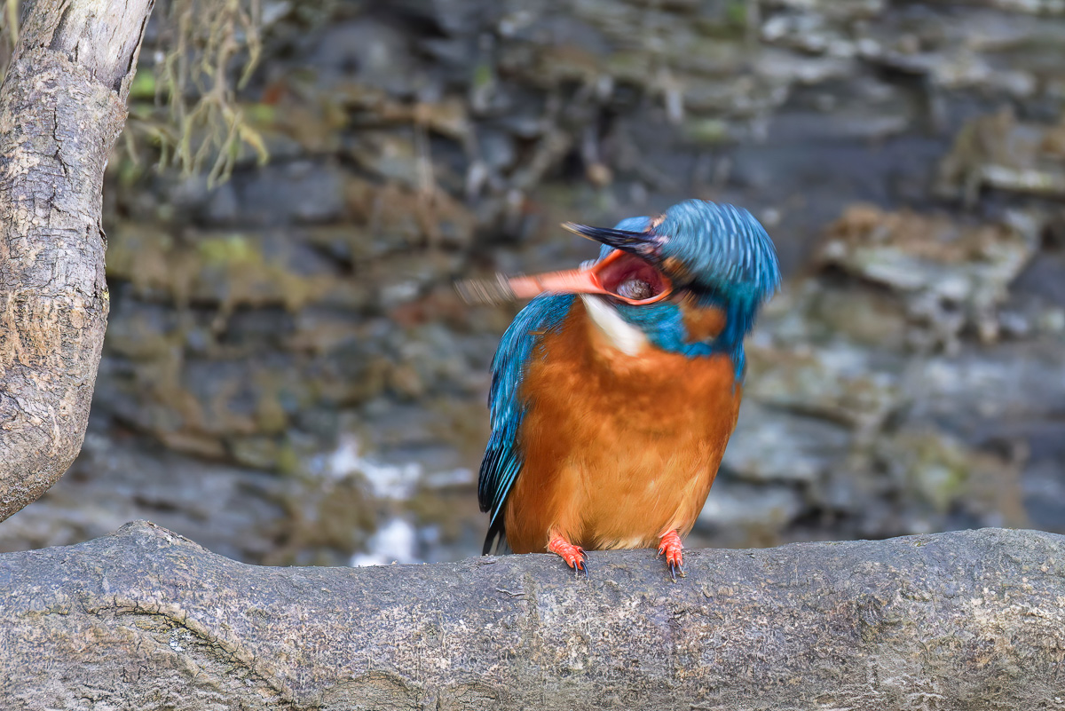 Eisvogel (Alcedo atthis) Männchen würgt mit heftigen Kopfbewegeungen das Gewölle heraus