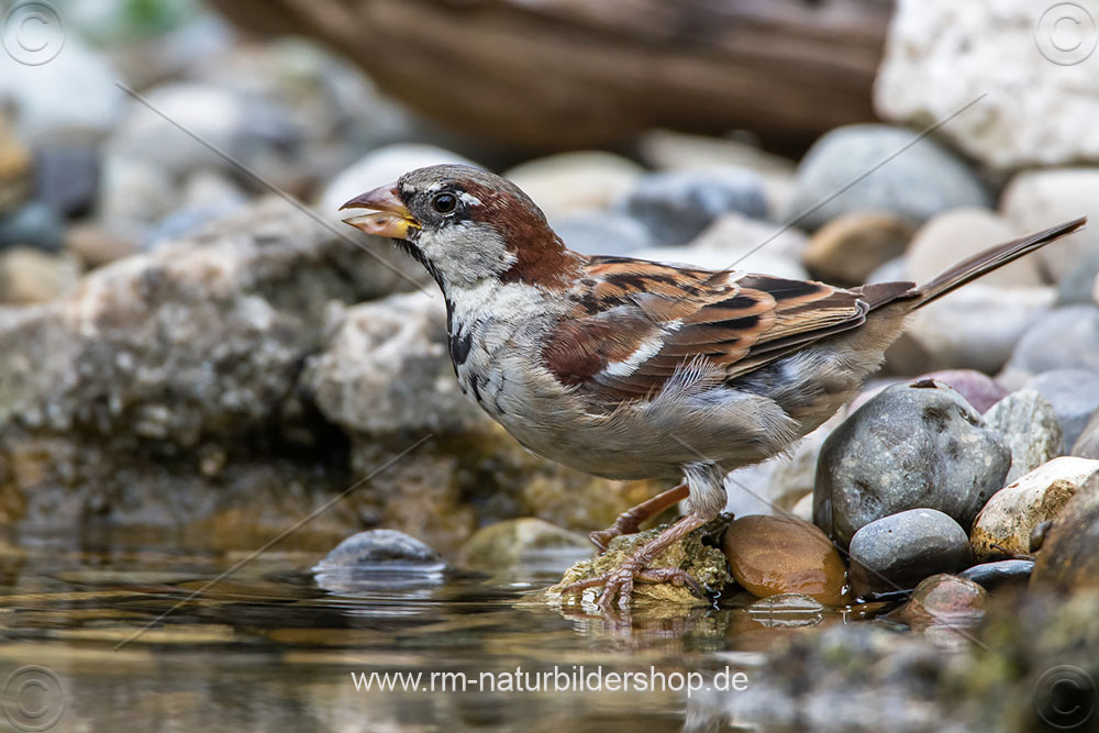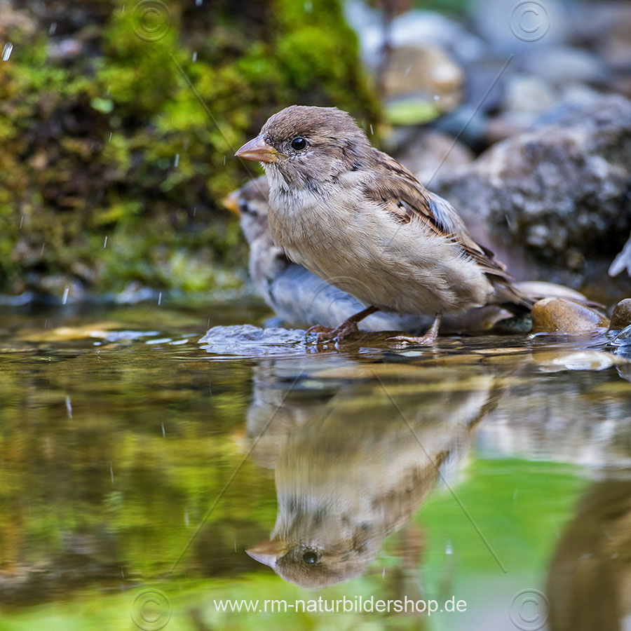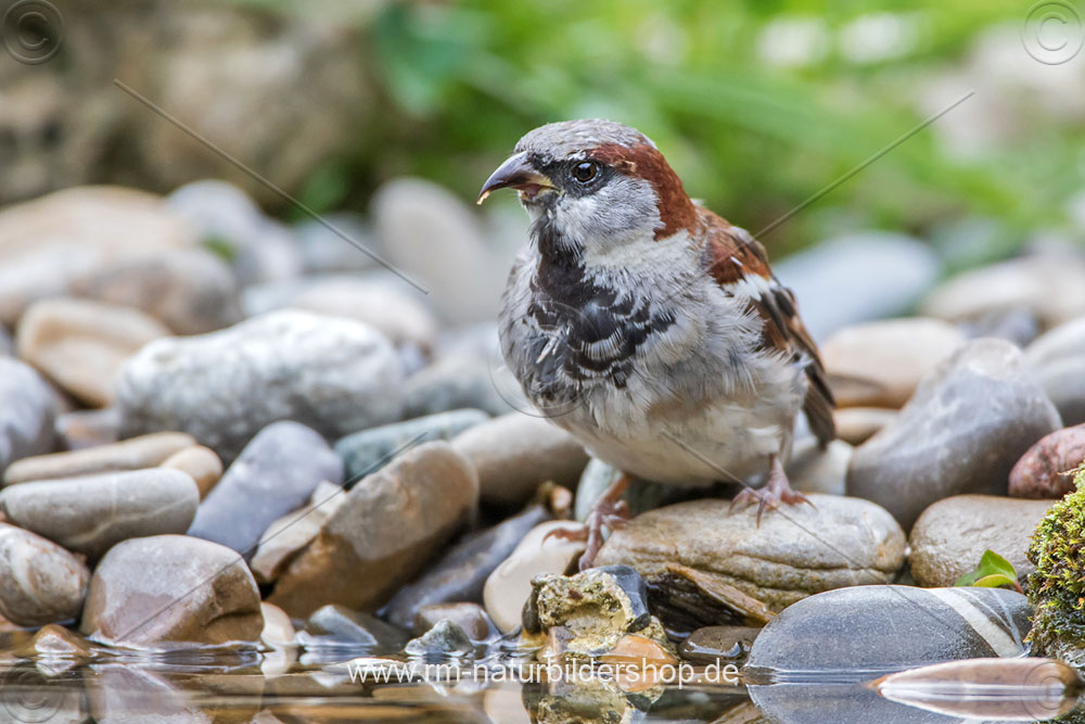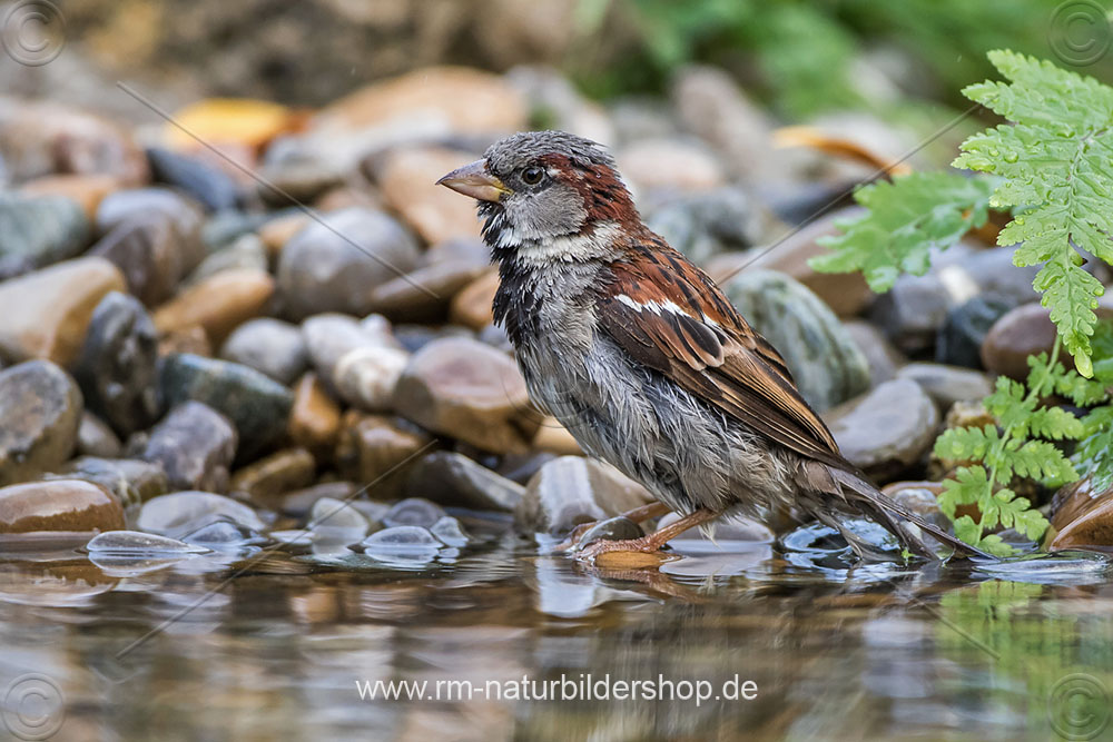 Haussperling (Passer domesticus) badendes Männchen