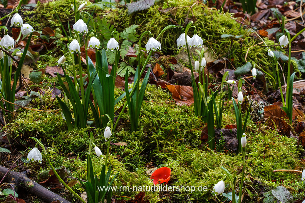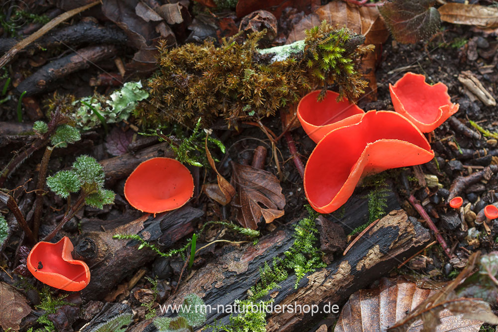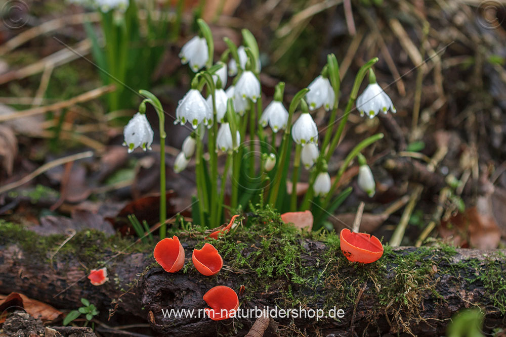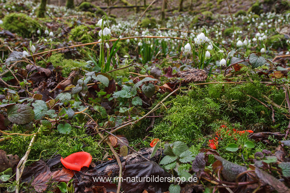 Scharlachroter Kelchbecherling (Sarcoscypha coccinea) und Märzenbecher