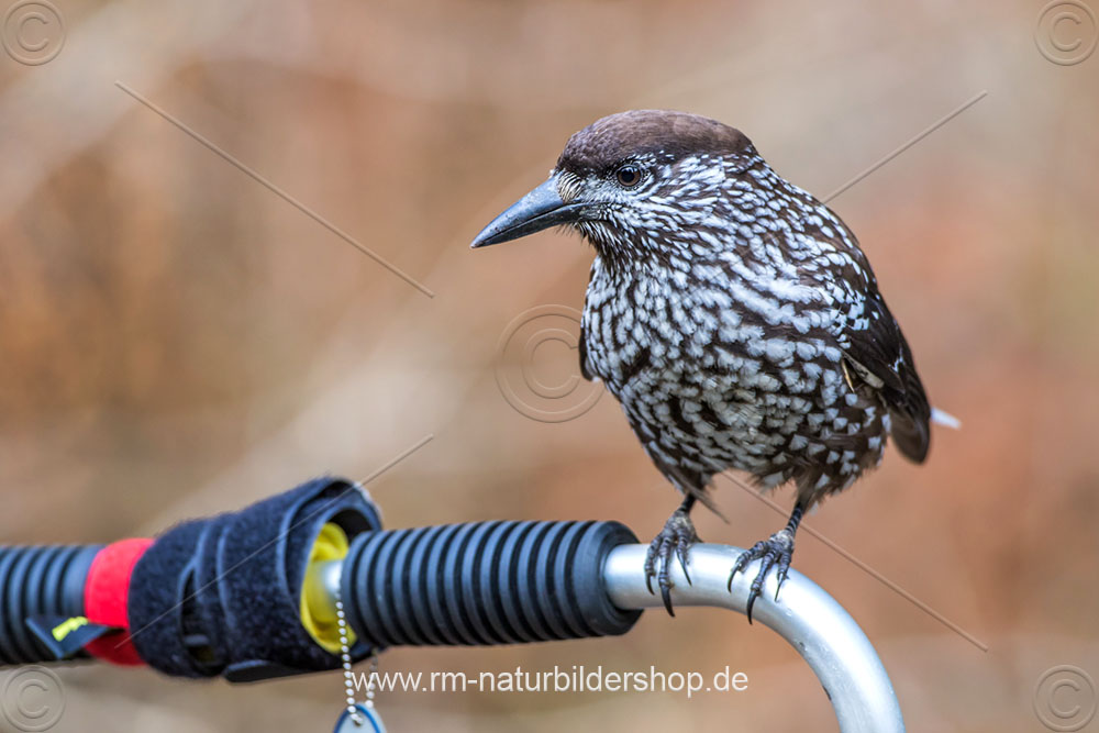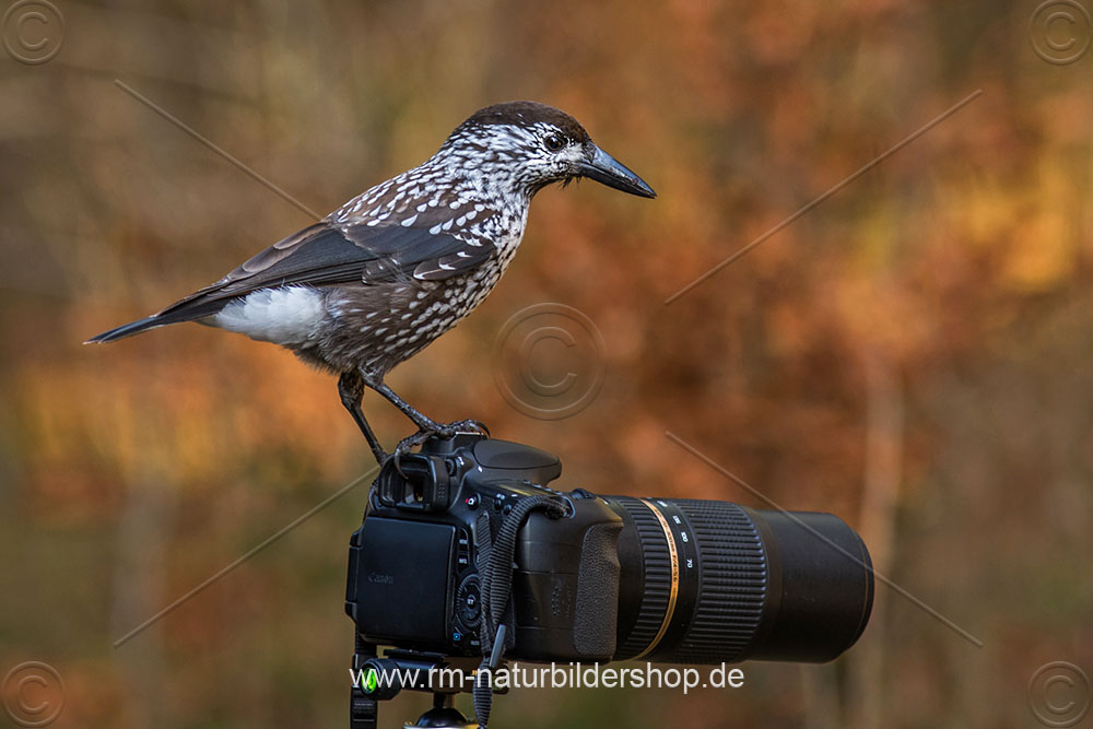 Tannenhäher (Nucifraga caryocatactes) sitzt auf Equipment