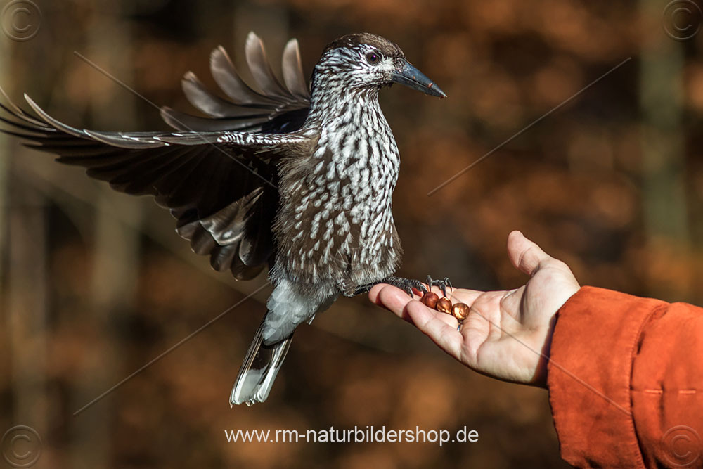 Tannenhäher (Nucifraga caryocatactes) nimmt Haselnüsse aus der Hand