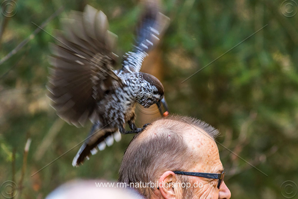Tannenhäher (Nucifraga caryocatactes) holt Haselnuss vom Kopf