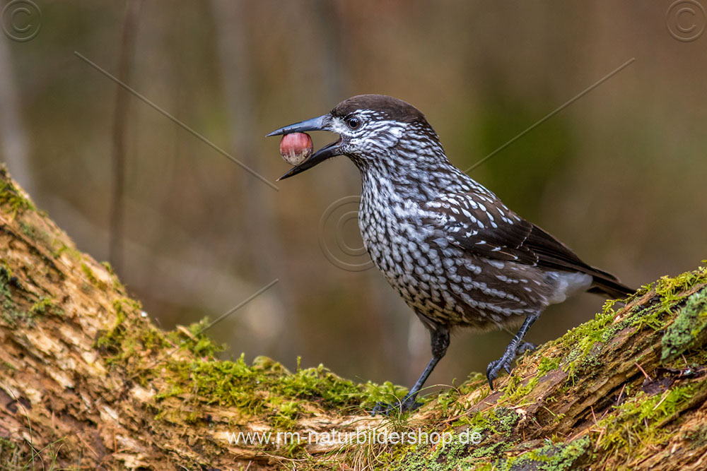 Tannenhäher (Nucifraga caryocatactes) mit Haselnuss