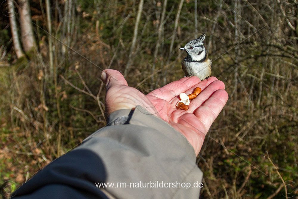 Haubenmeise (Lophophanes cristatus) holt Futter aus der Hand
