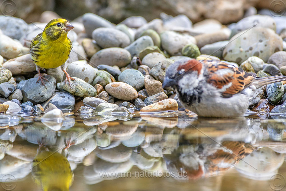 Girlitz (Serinus serinus) Männchen und Haussperling