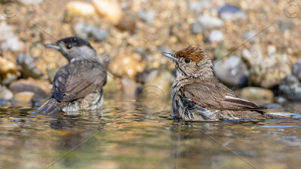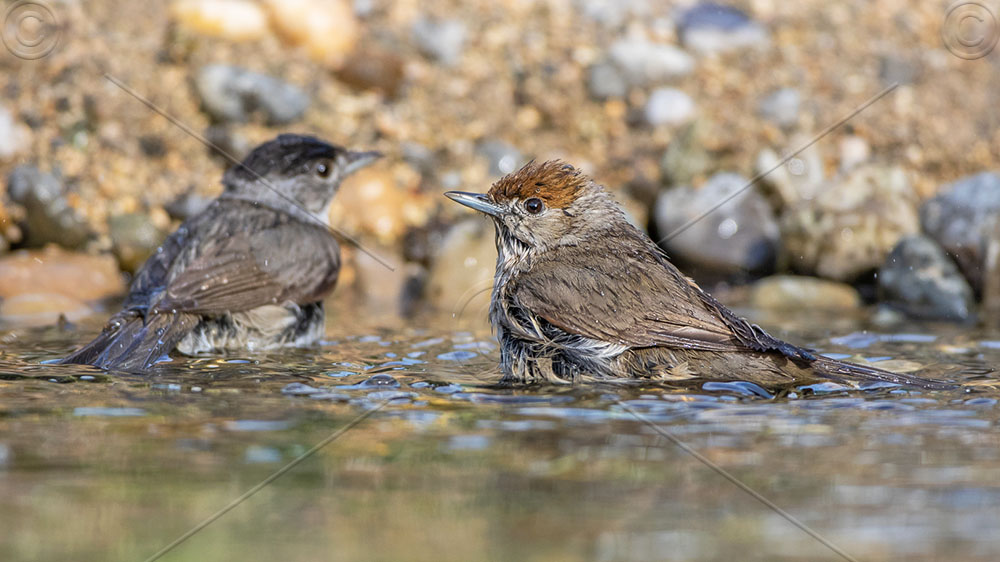 Mönchsgrasmücke (Sylvia atricapilla) Weibchen und Männchen badend