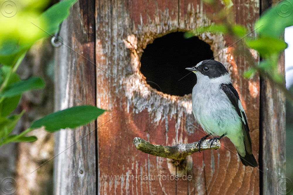 Halsbandschnäpper (Ficedula albicollis) Männchen an Nistkasten