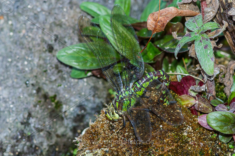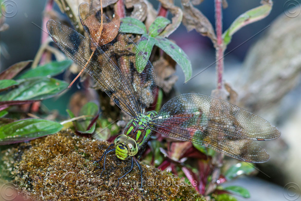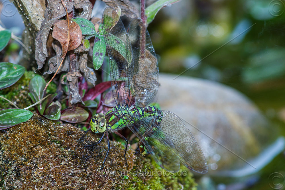 Blaugrüne Mosaikjungfer (Aeshna cyanea) Weibchen beim Eierlegen