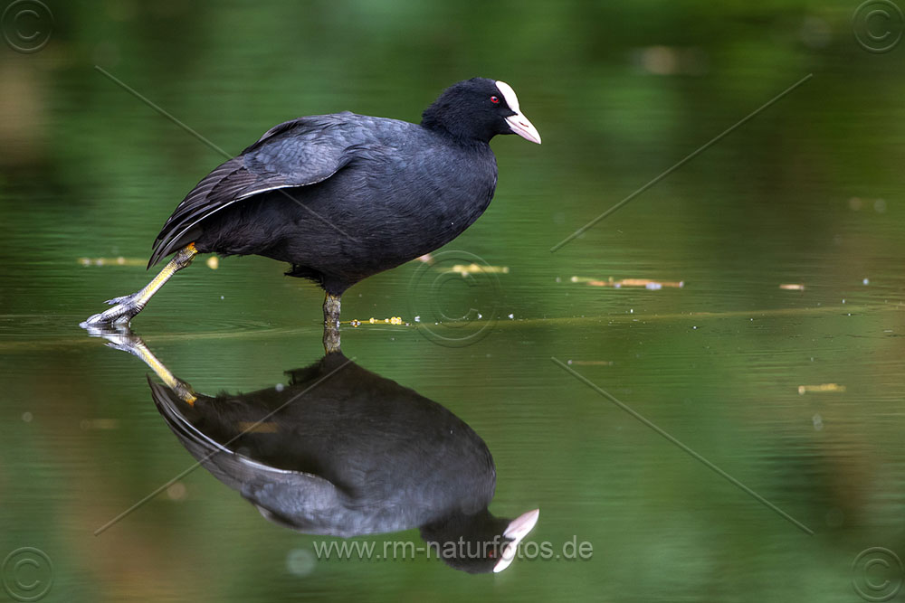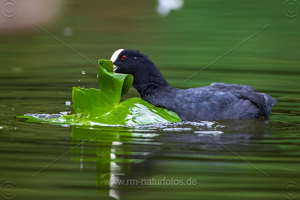 Bläßhuhn (Fulica atra) mit Seerosenblatt