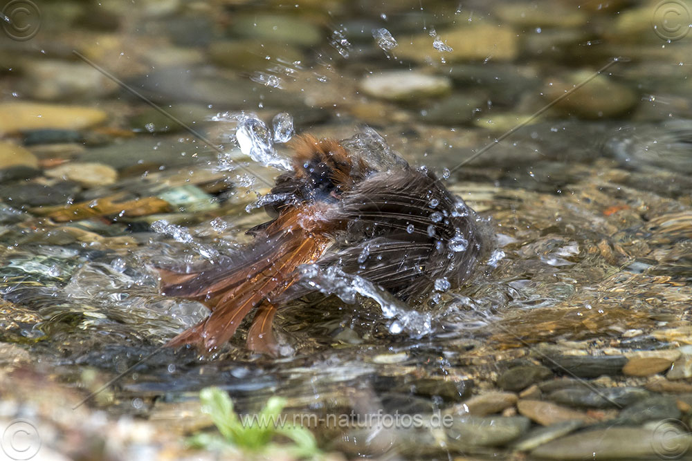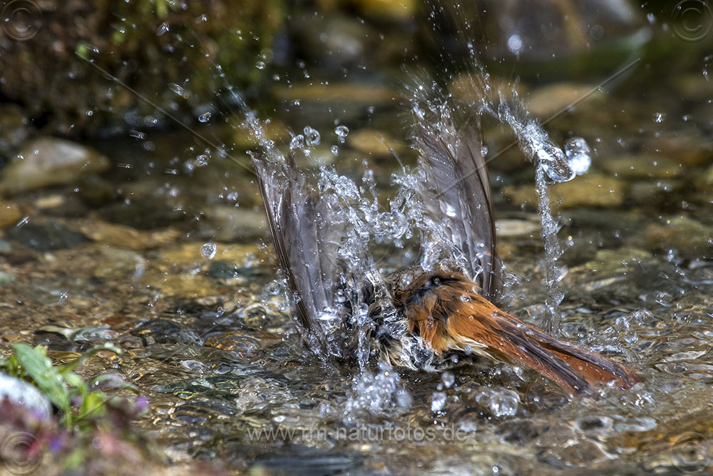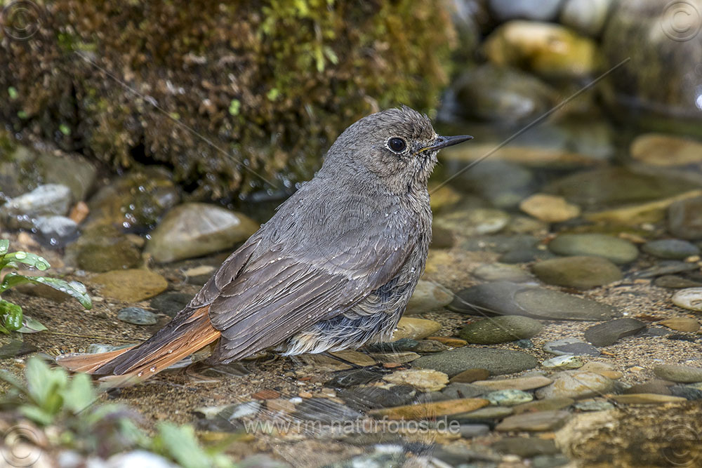 Hausrotschwanz (Phoenicurus ochruros) Weibchen badet