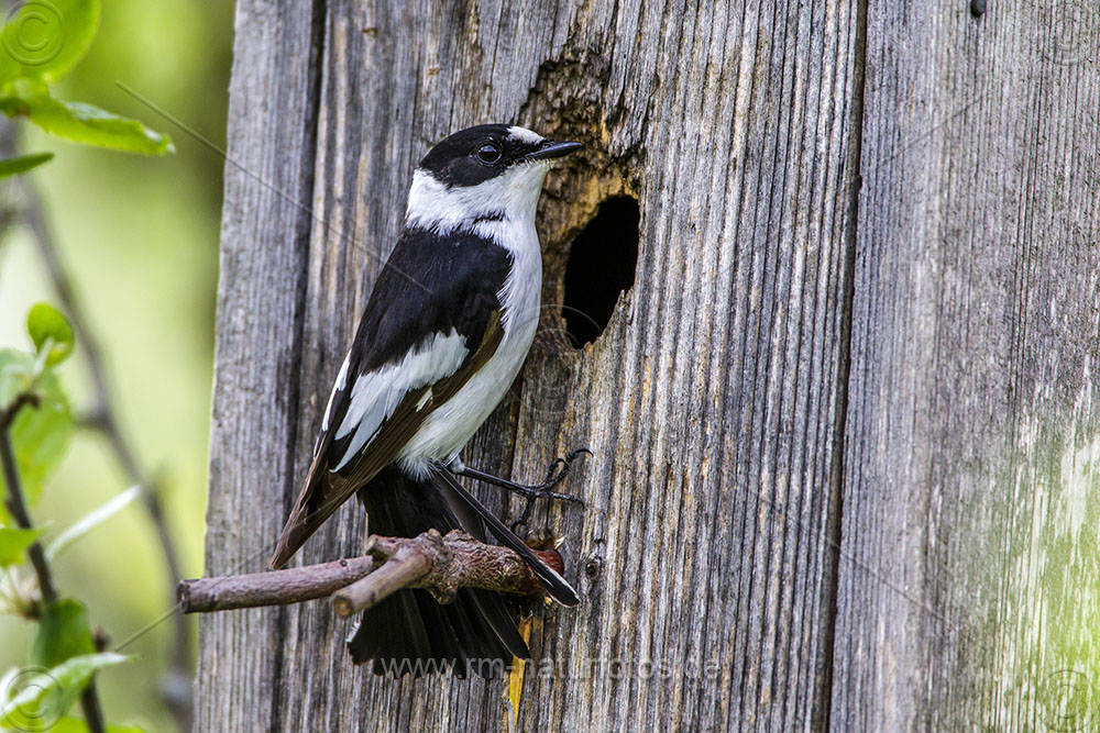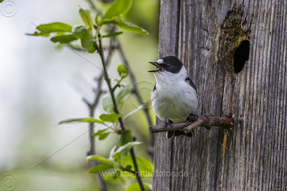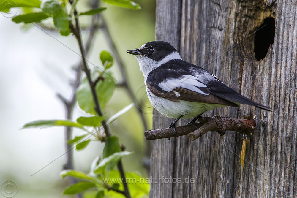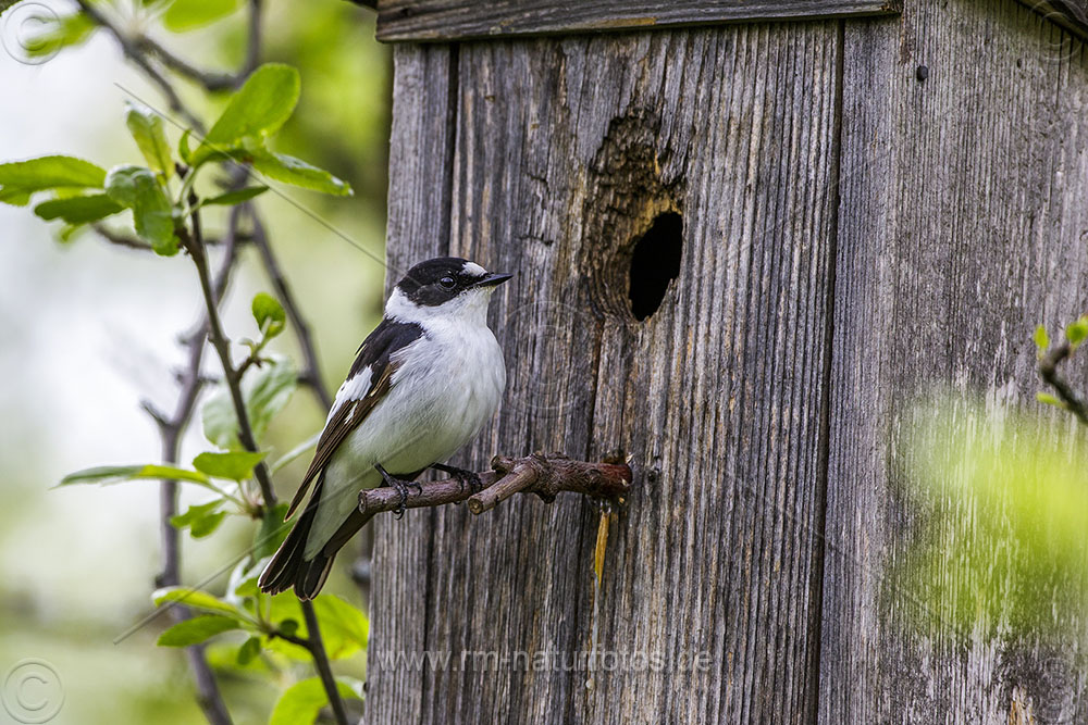 Halsbandschnäpper (Ficedula albicollis) Männchen an Nistkasten