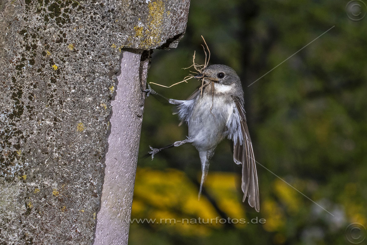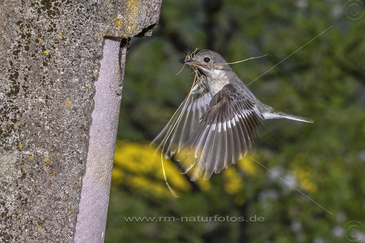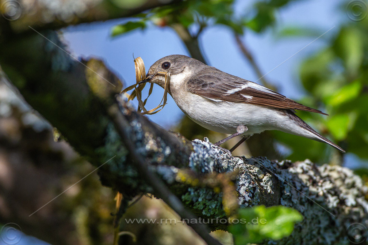 Halsbandschnäpper (Ficedula albicollis) Weibchen mit Nistmaterial