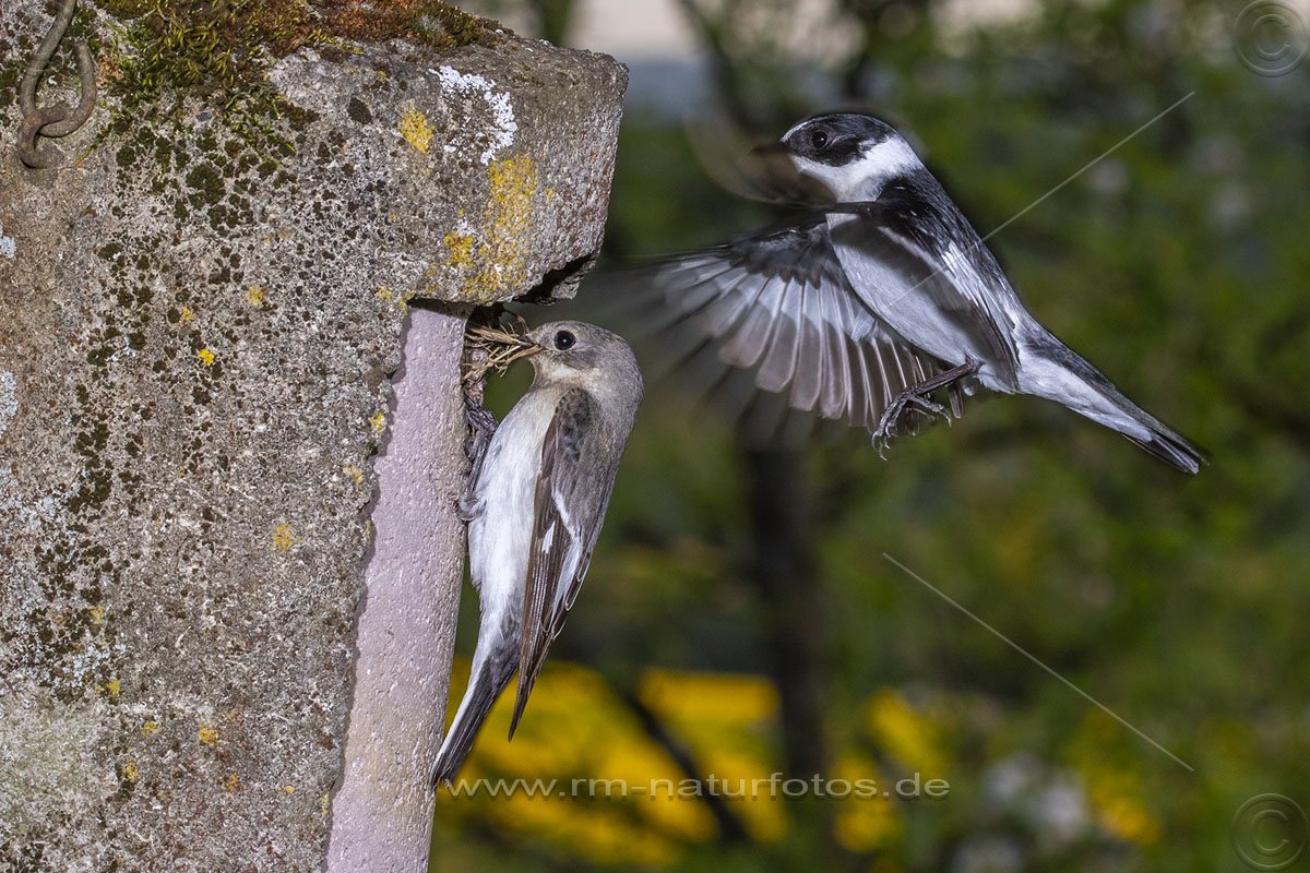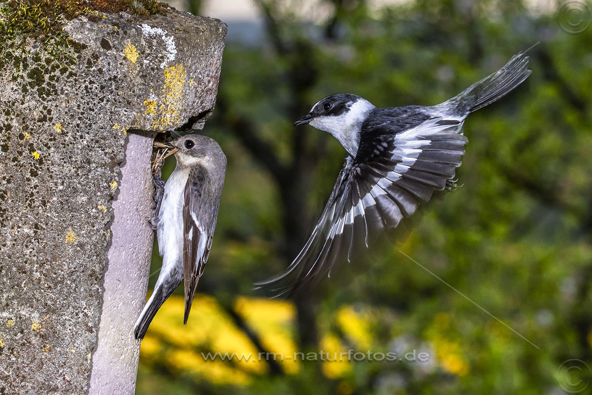 Halsbandschnäpper (Ficedula albicollis) Männchen und Weibchen am Nistkasten