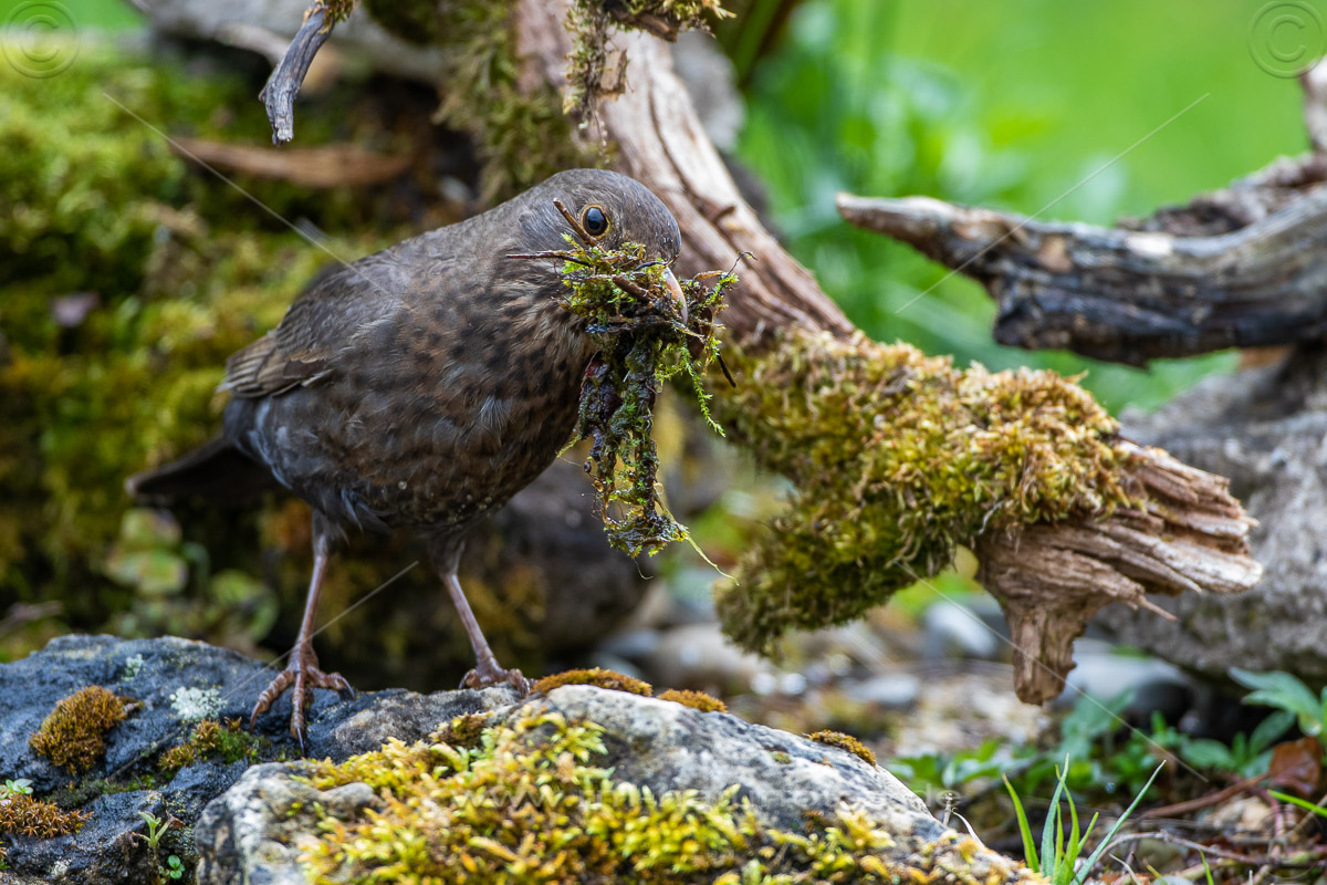 Amsel (Turdus merula) Weibchen mit Nistmaterial