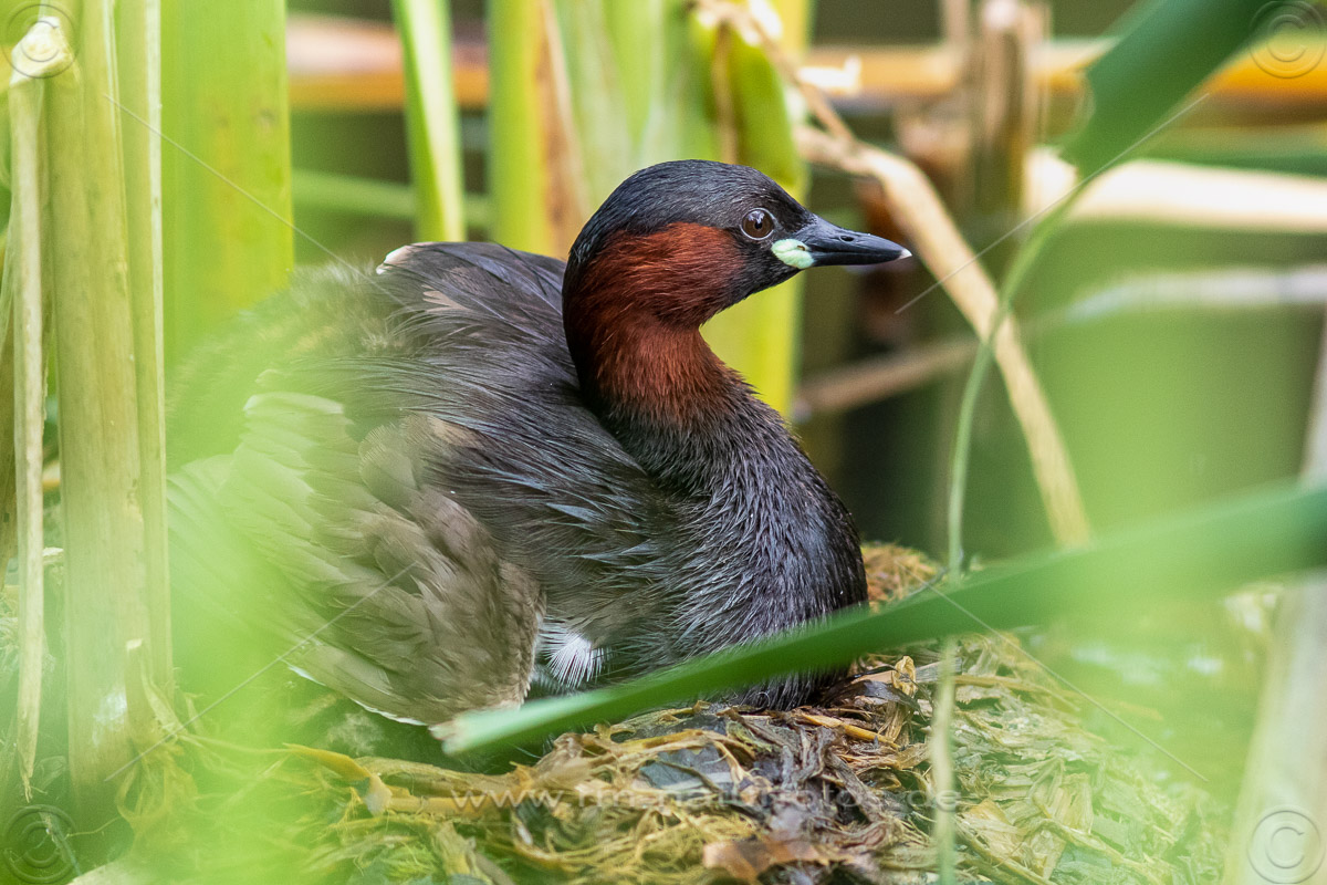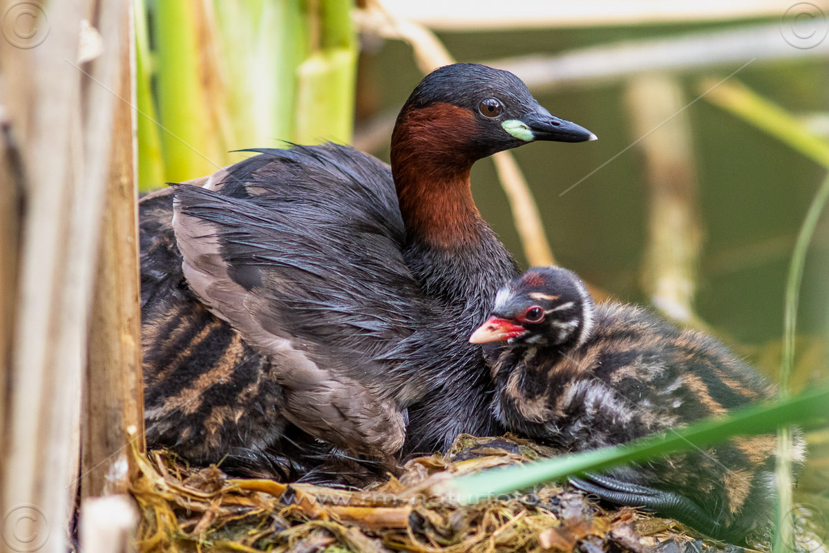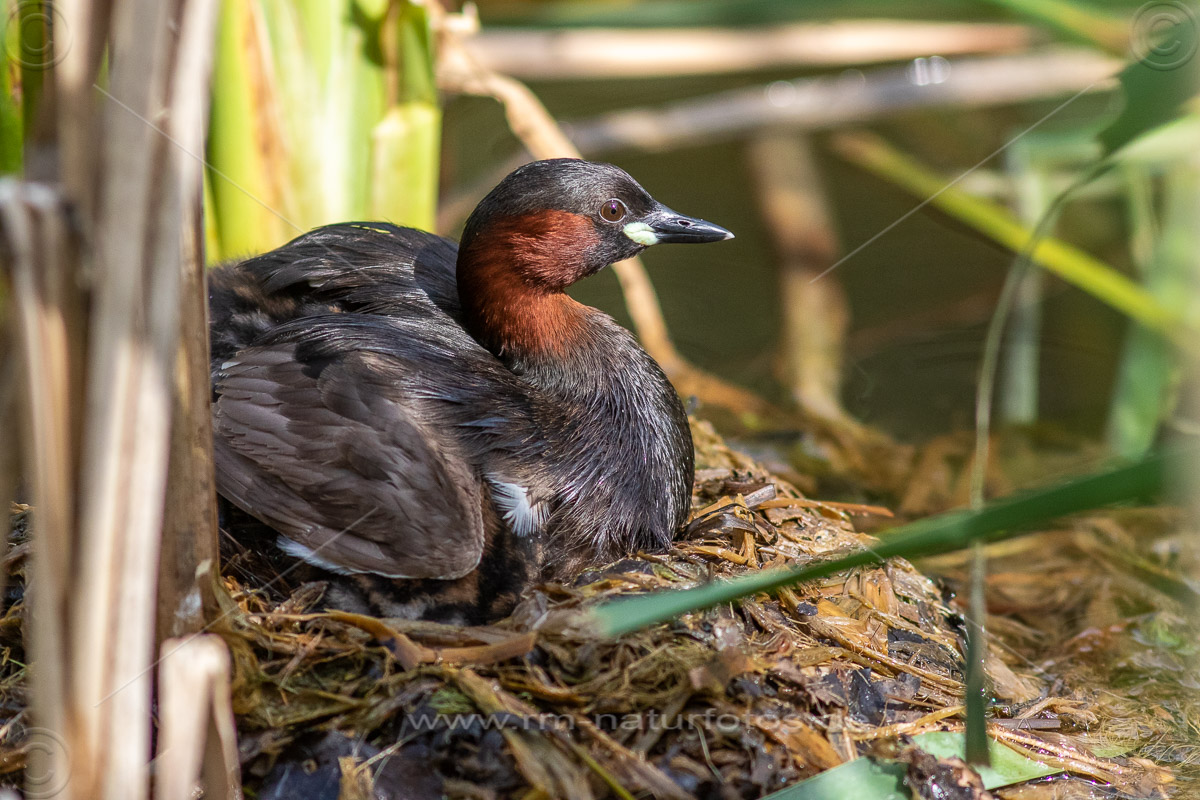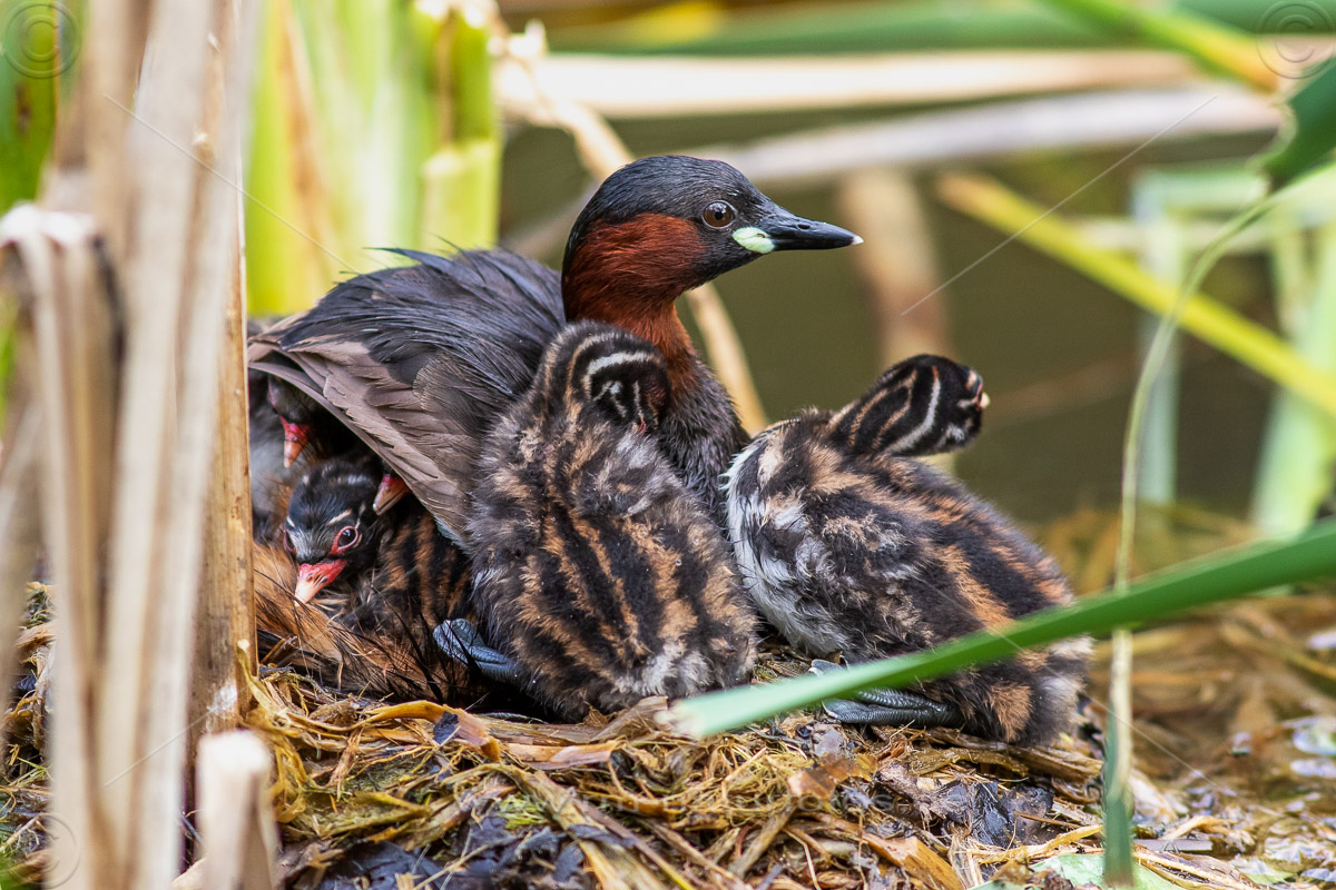 Zwergtaucher (Tachybaptus ruficollis) mit Jungen auf dem Nest