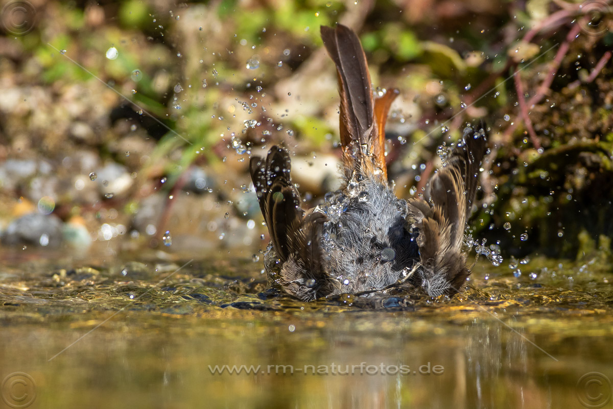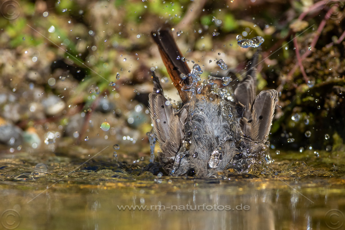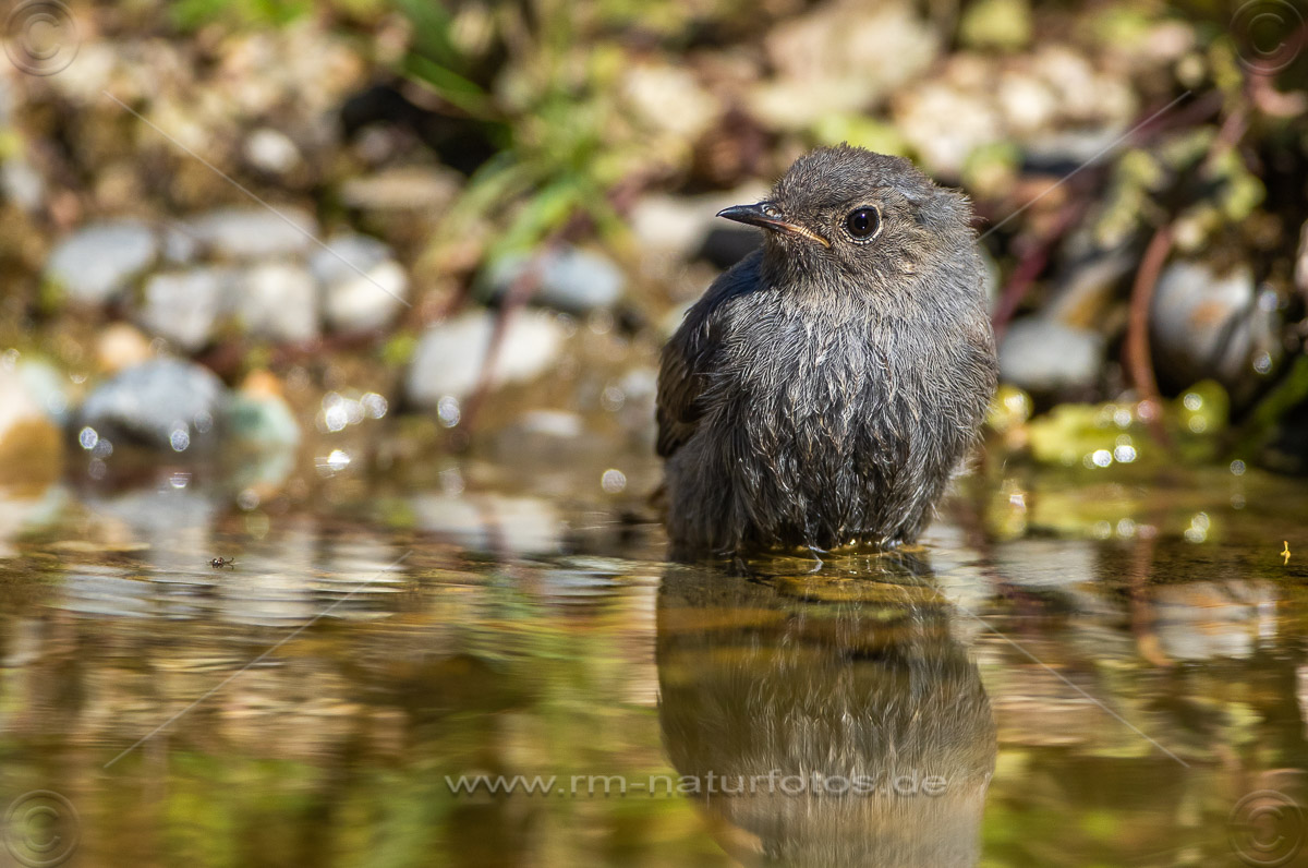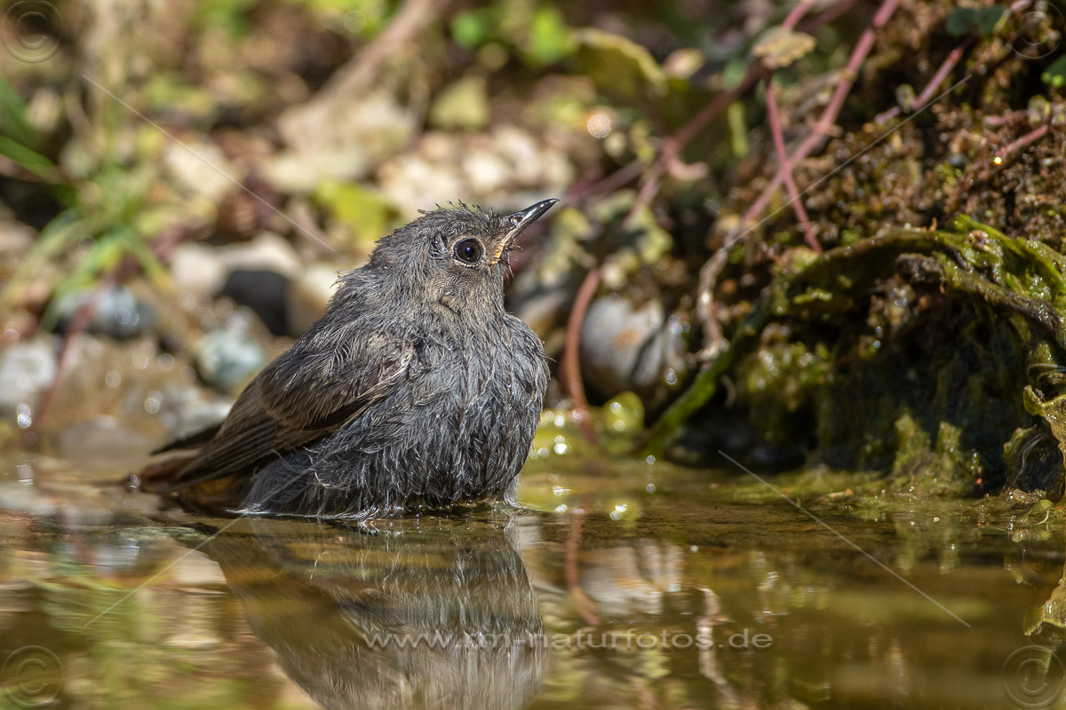 Hausrotschwanz (Phoenicurus ochruros) Jungvogel badet