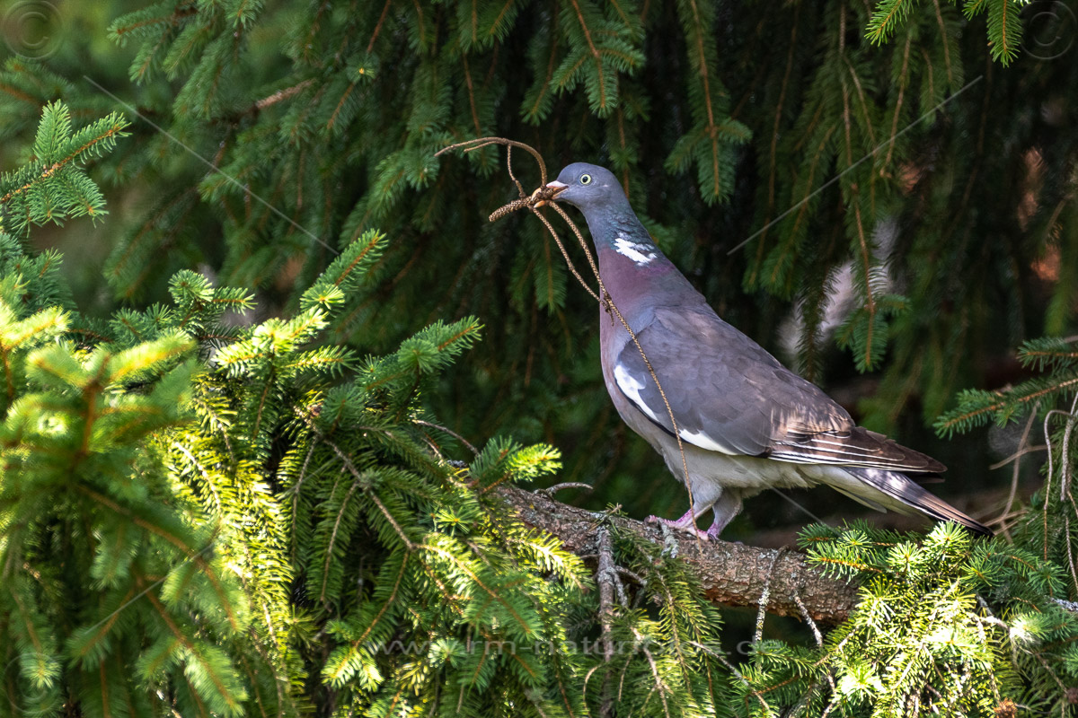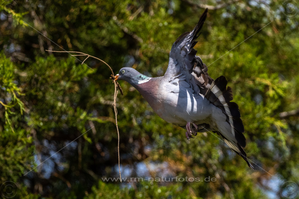 Ringeltaube (Columba palumbus) mit Nistmaterial