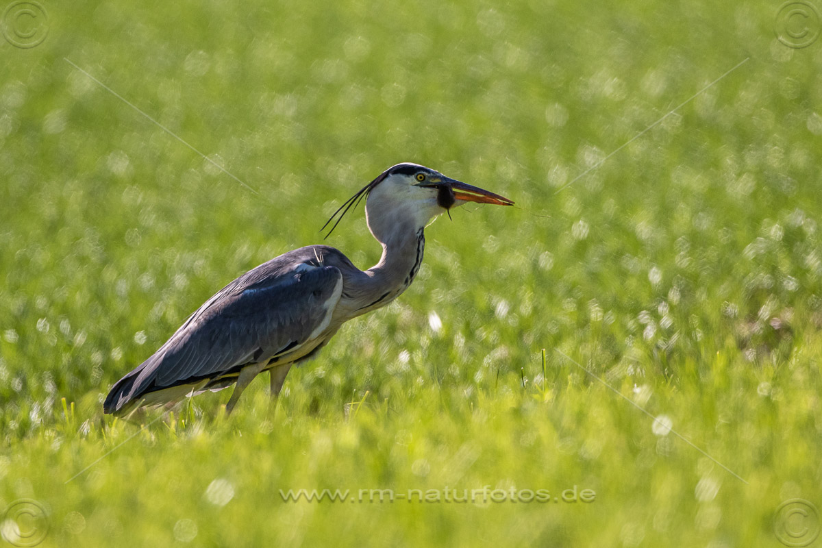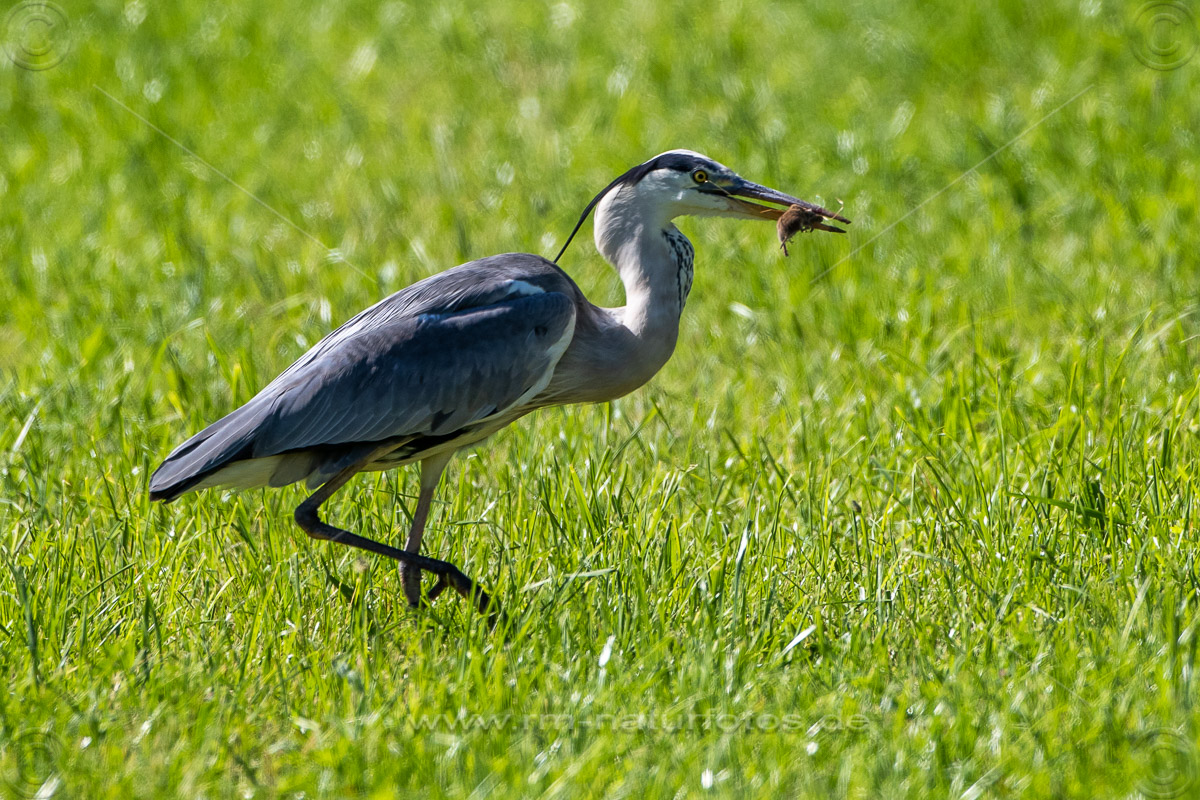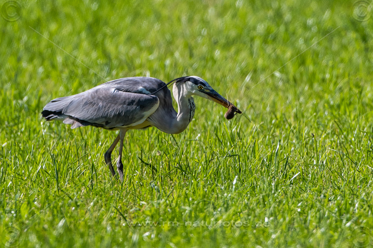 Graureiher (Ardea cinerea) mit gefangener Maus