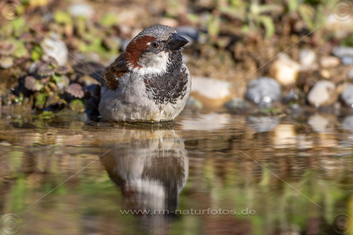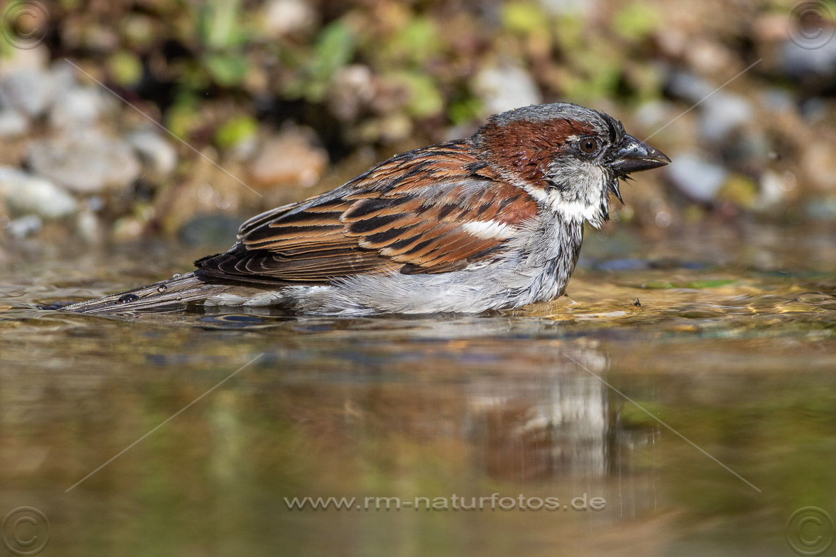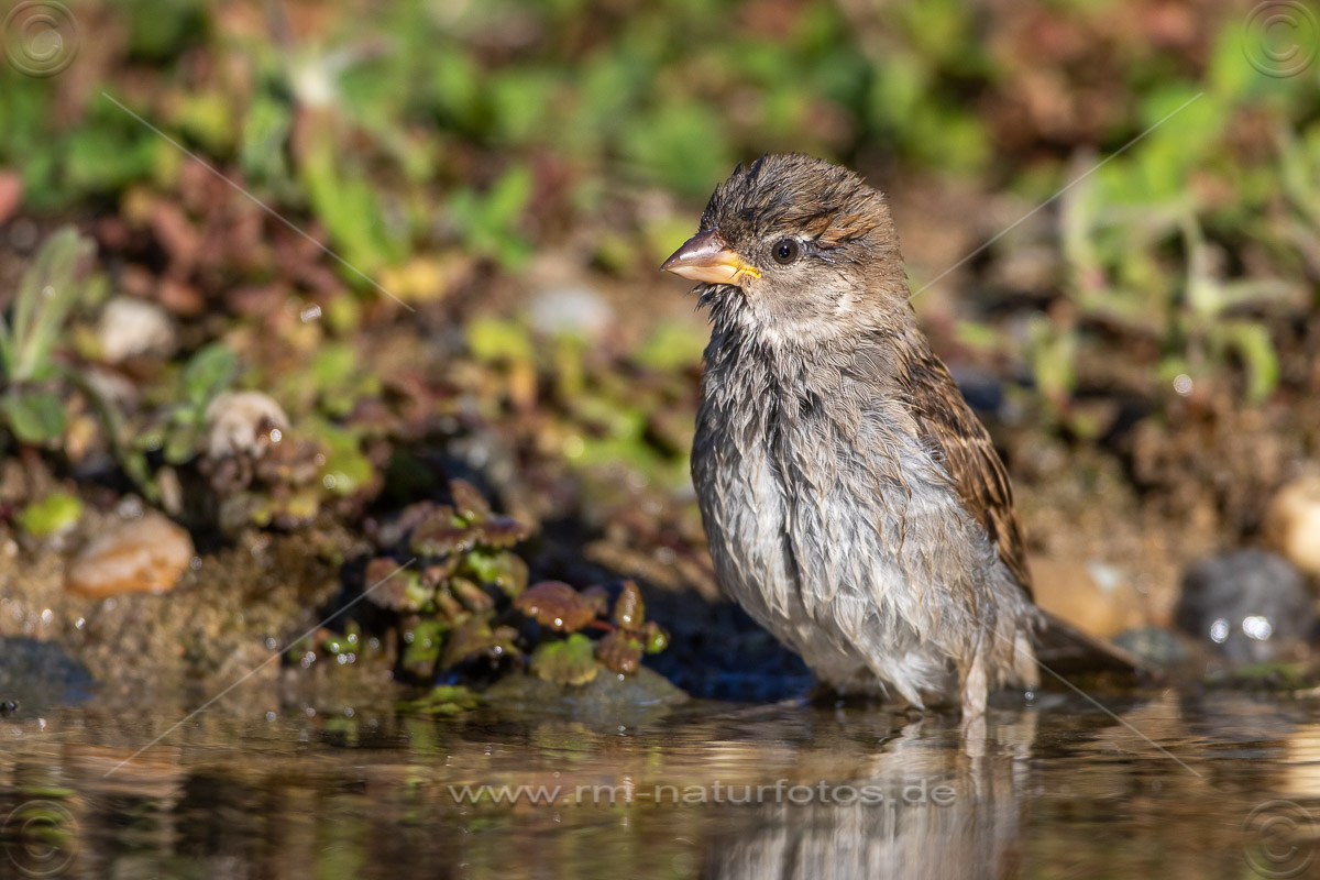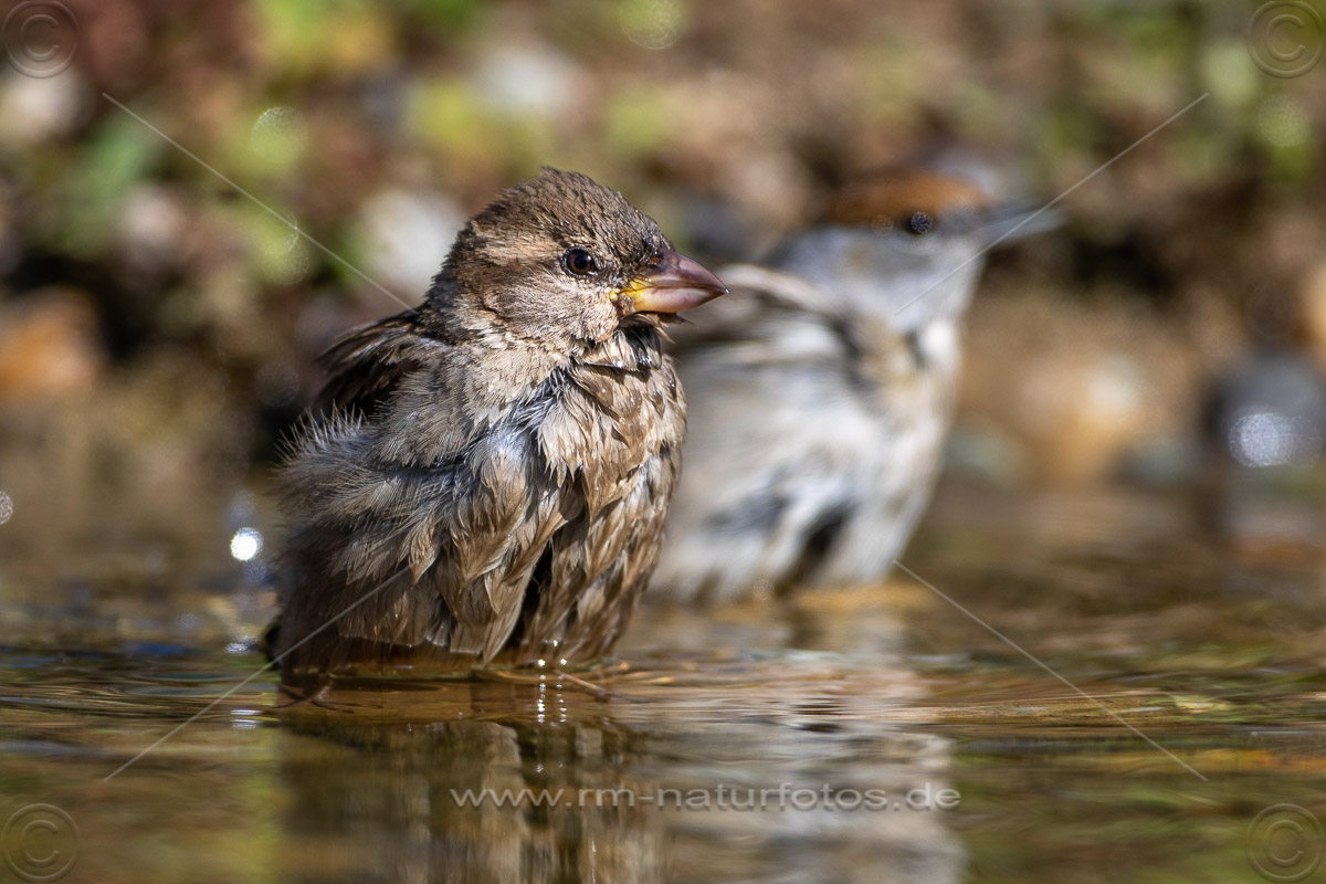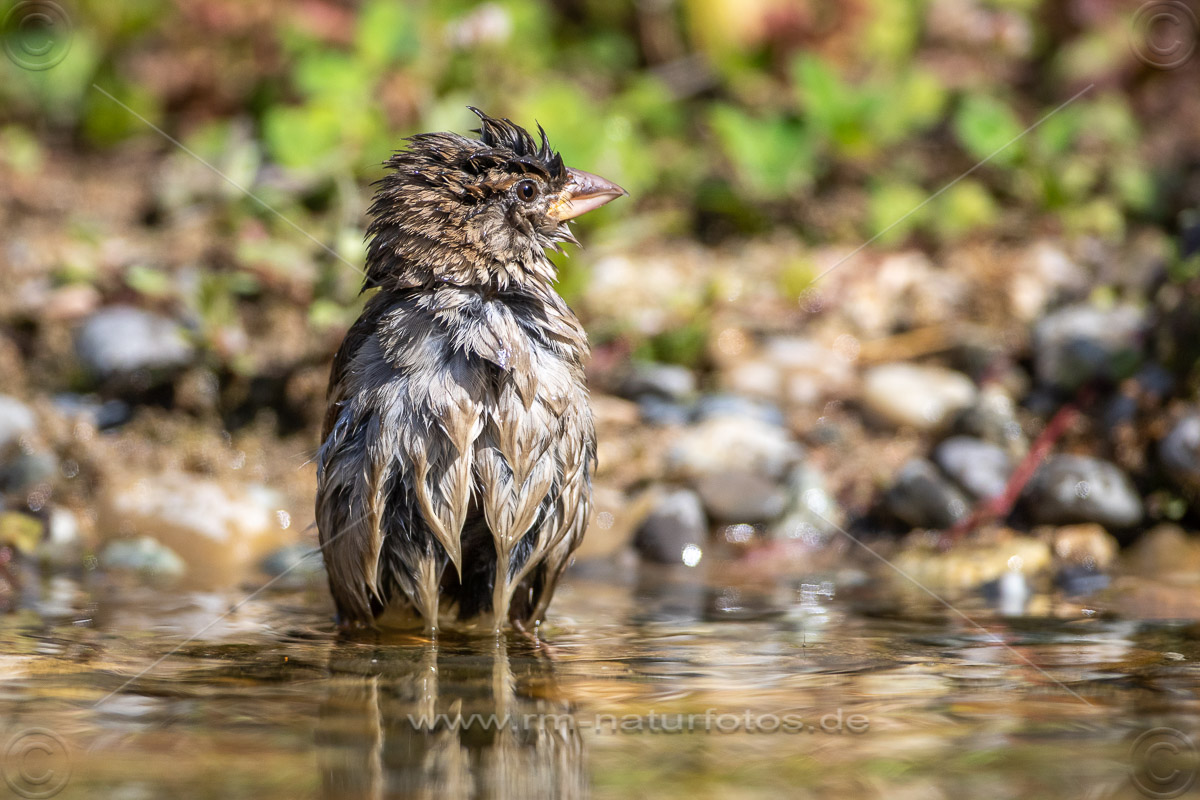 Haussperling (Passer domesticus) Weibchen beim Baden
