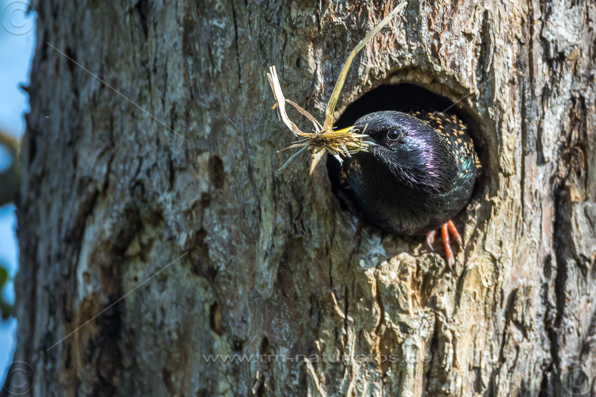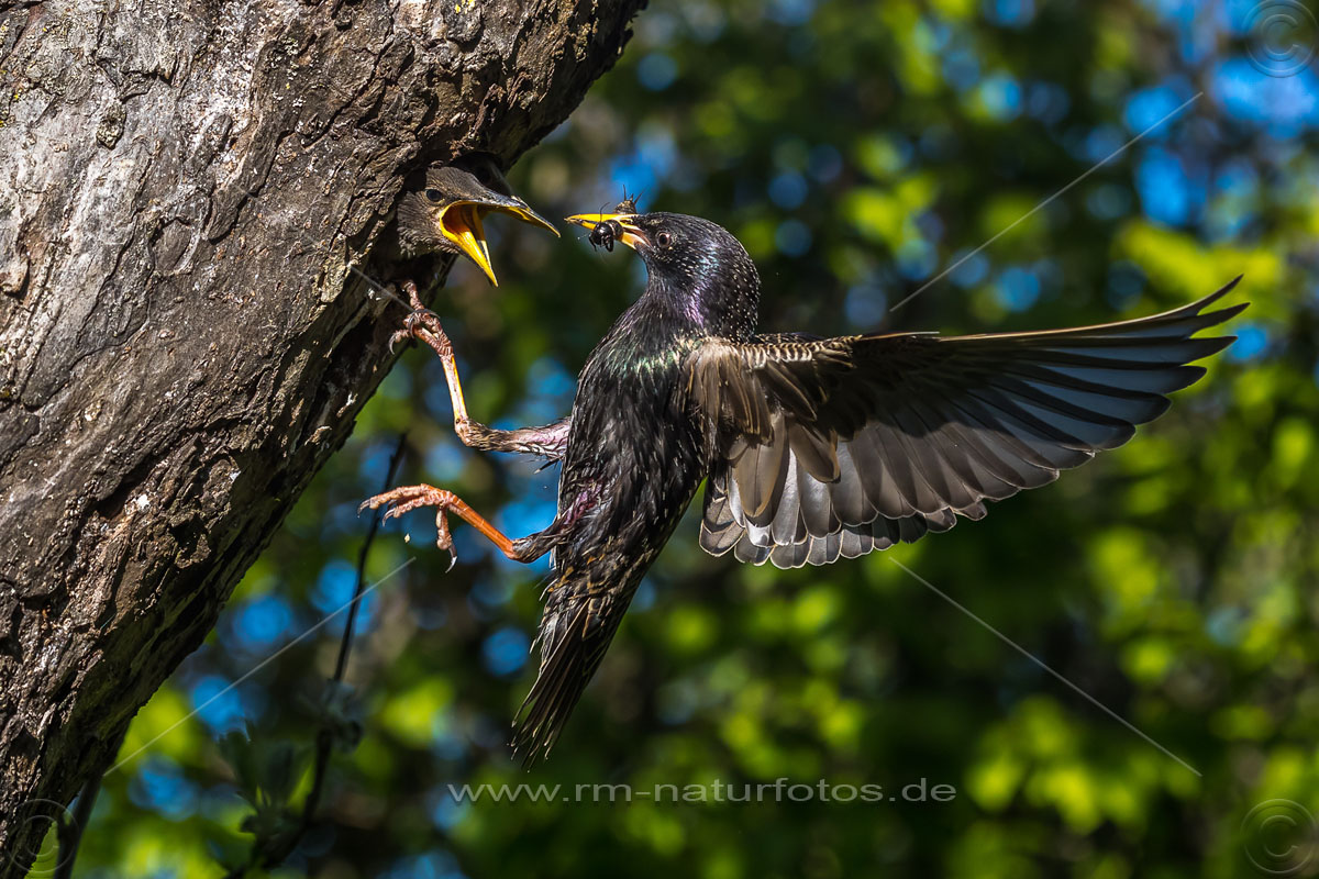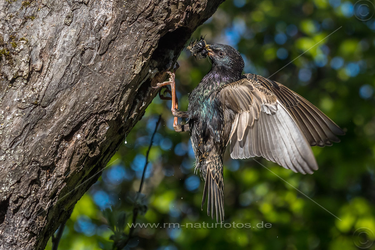 Star (Sturnus vulgaris) fliegt seine Höhle an