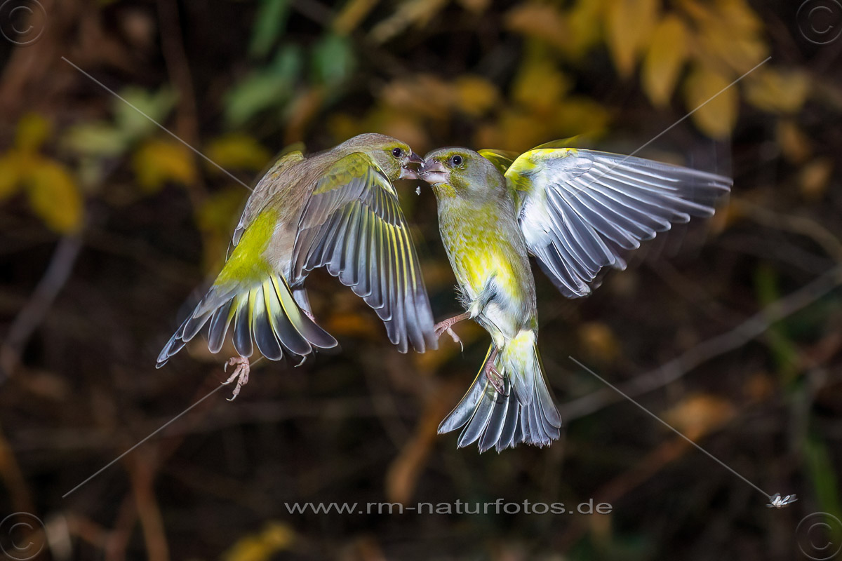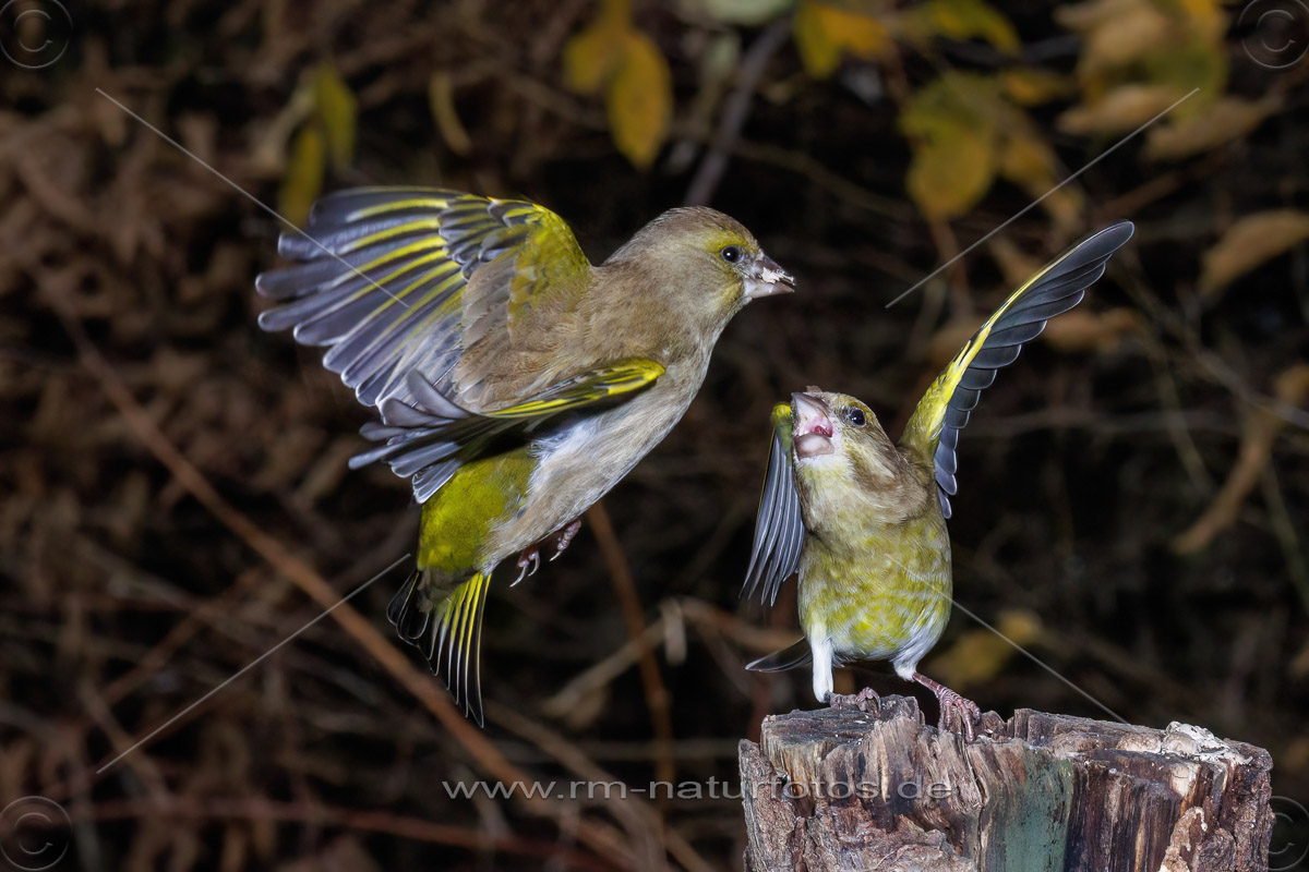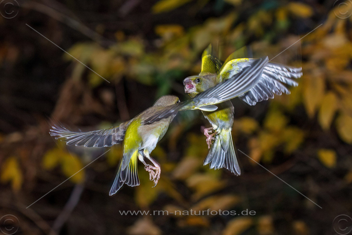 Grünfinken (Carduelis chloris) streiten sich - Kurzzeitblitztechnik