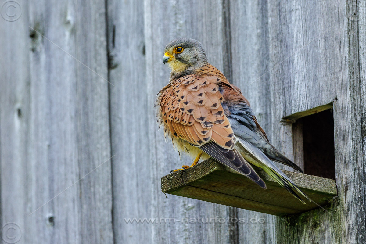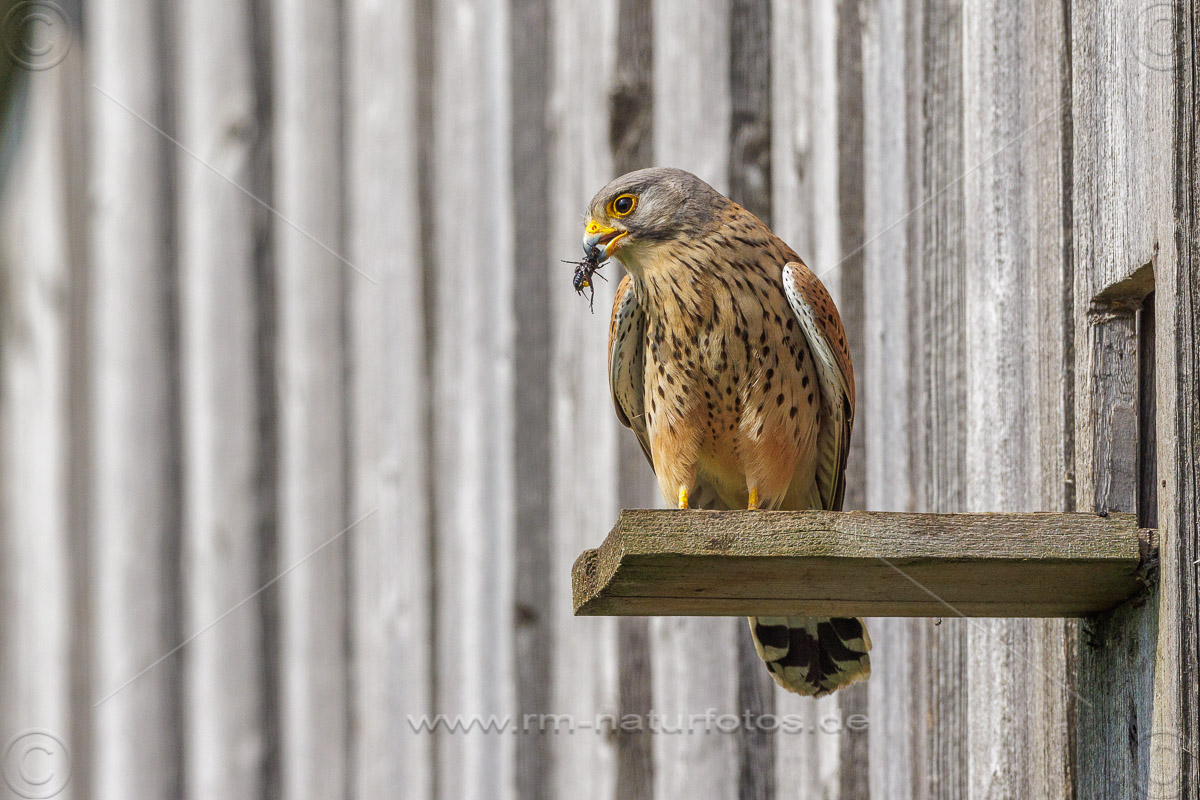 Turmfalke (Falco tinnunculus) Männchen mit Feldgrille