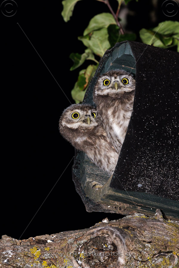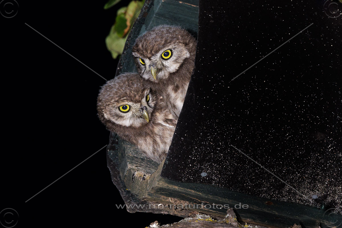 Junge Steinkäuze (Athene noctua) im Nistkasten