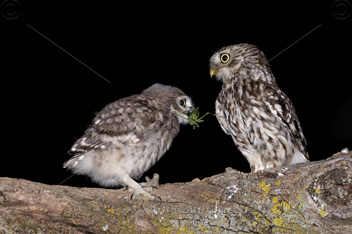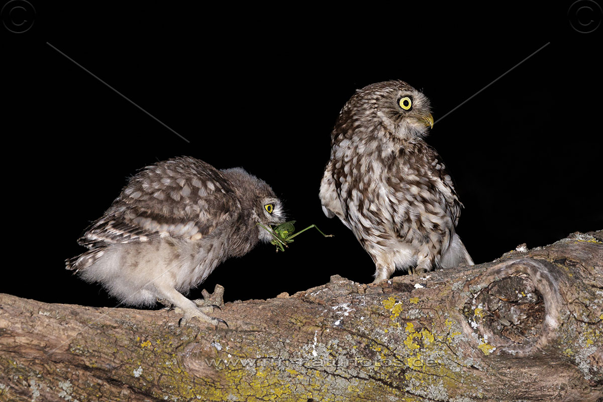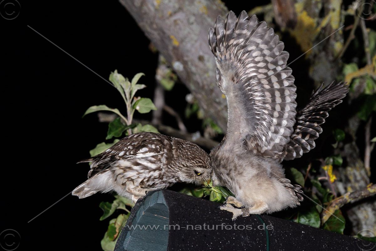 Junger Steinkauz (Athene noctua) wird gefüttert