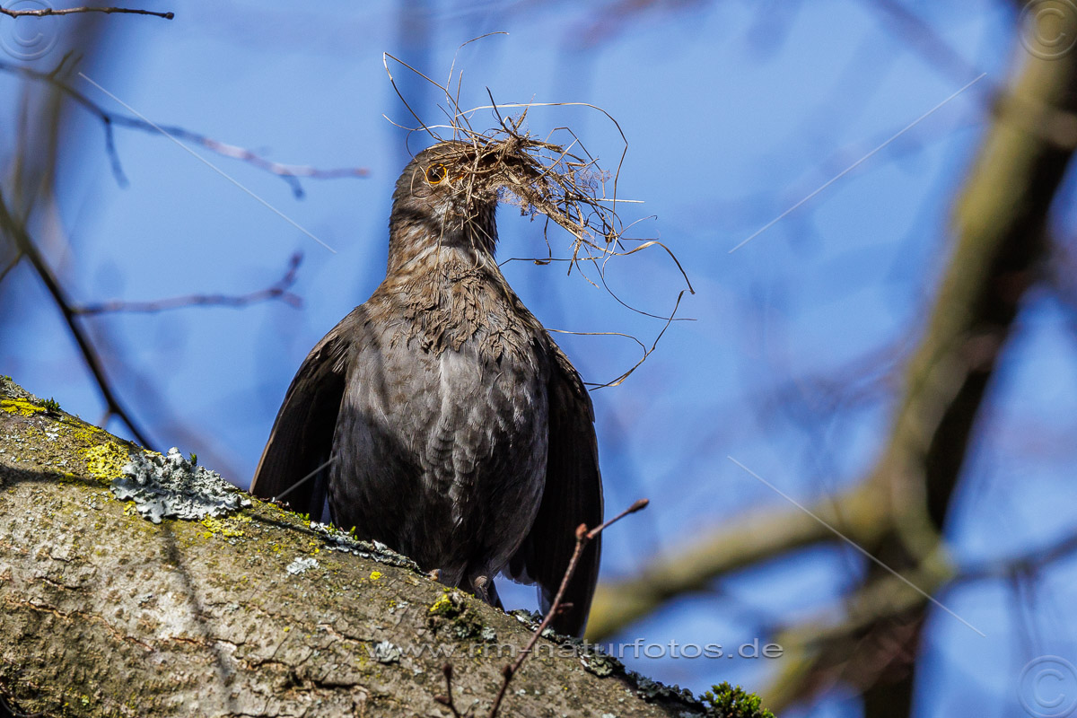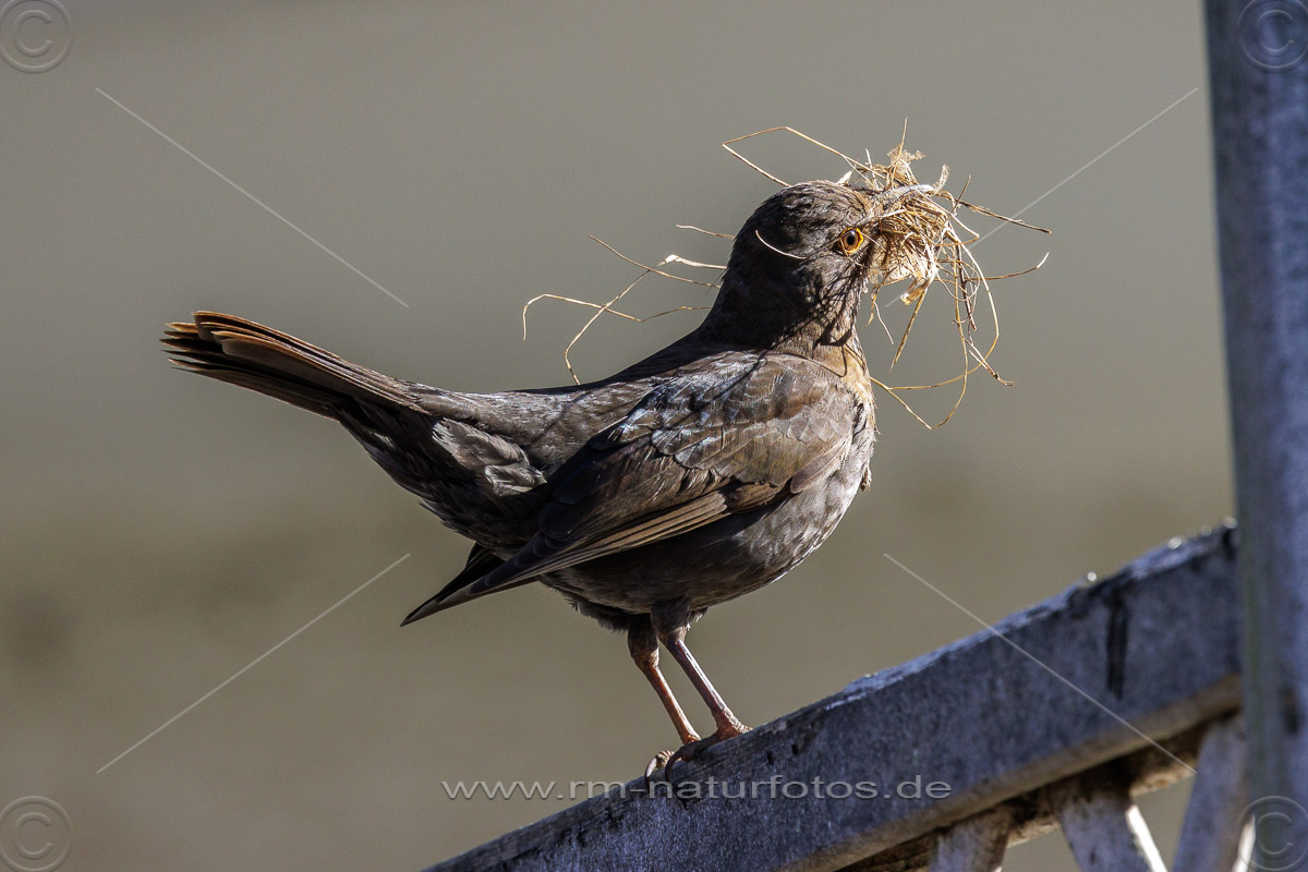 Amsel (Turdus merula) Weibchen mit Nistmaterial