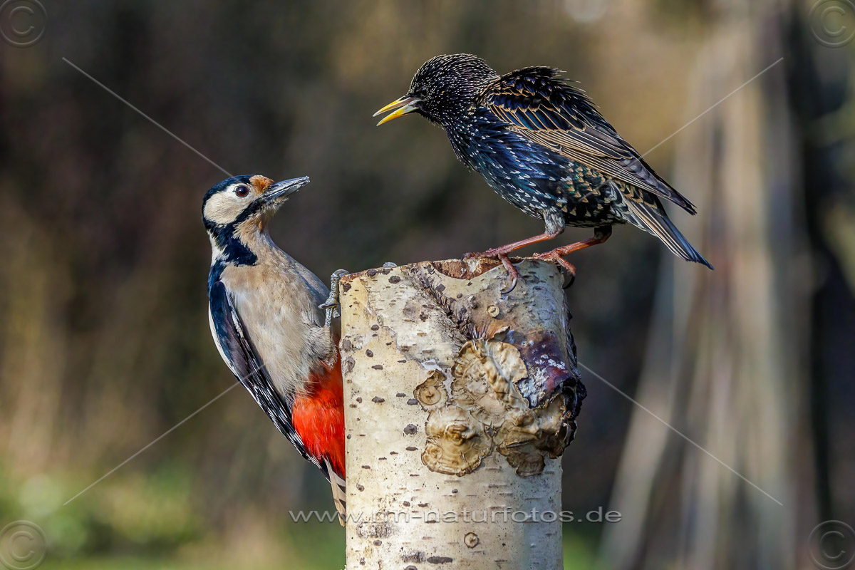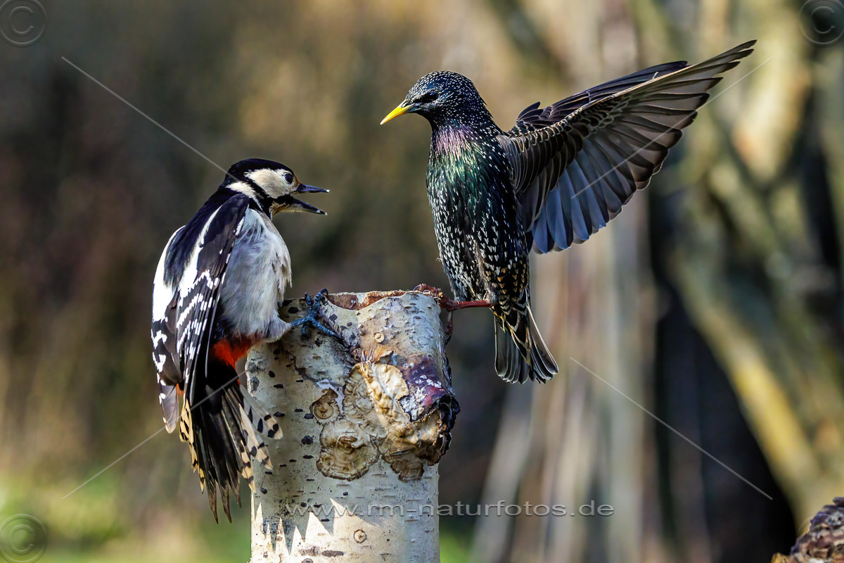 Star streitet mit Buntspecht
