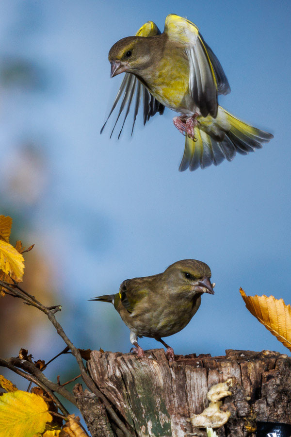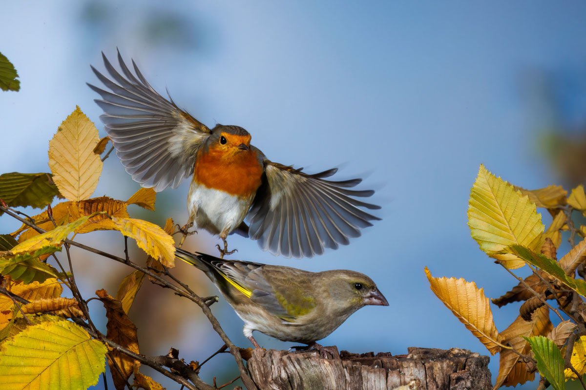 Grünfink (Carduelis chloris) und Rotkehlchen