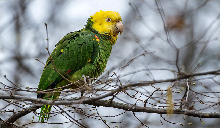 Gelbkopfamazone (Amazona oratrix) frisst Blüten der Trauerweide