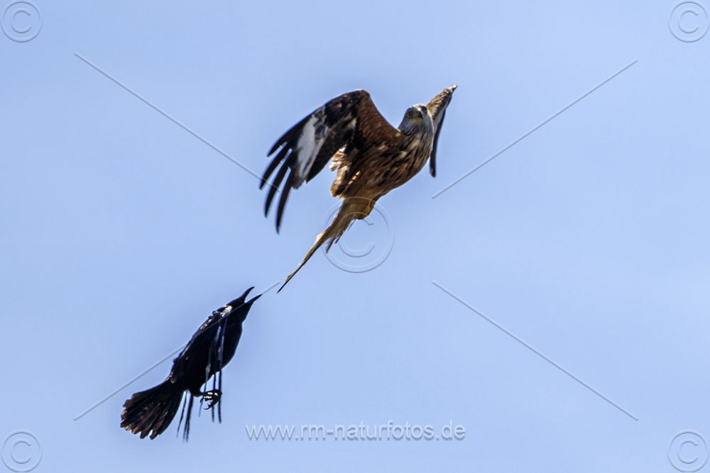 Rotmilan (Milvus milvus) wird von Rabenkrähe geärgert