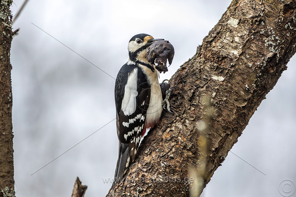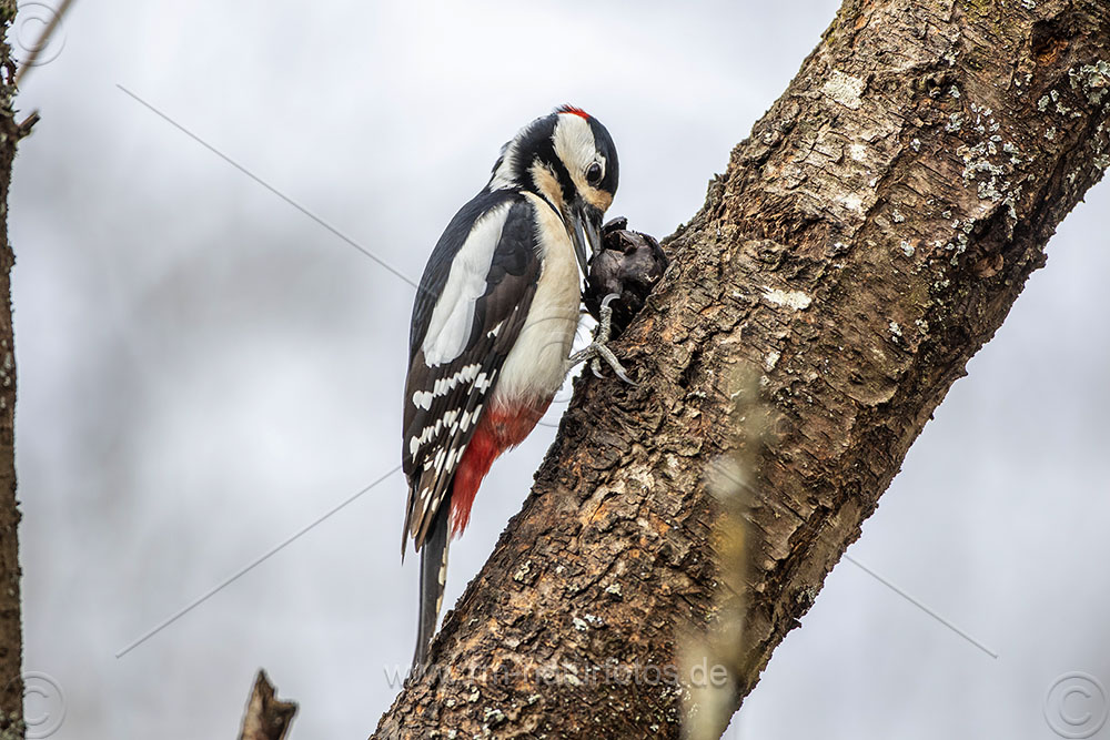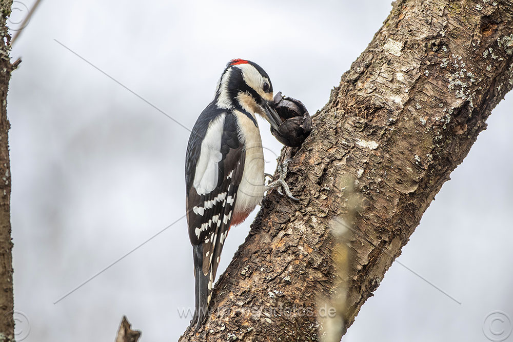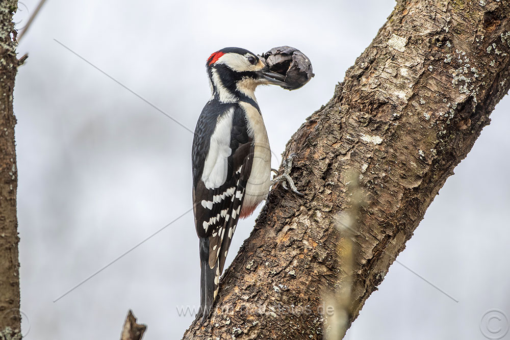 Buntspecht (Dendrocopos major) Männchen mit Walnuß