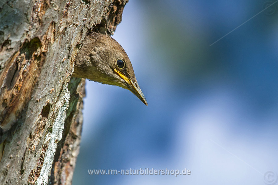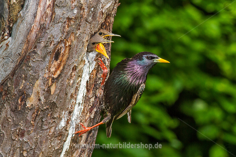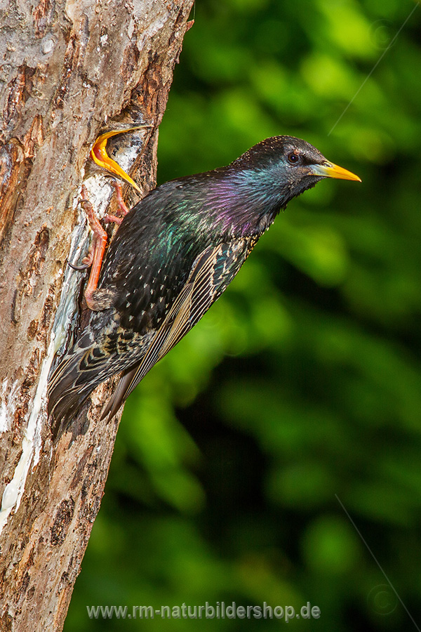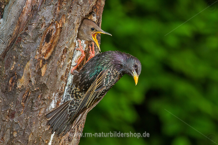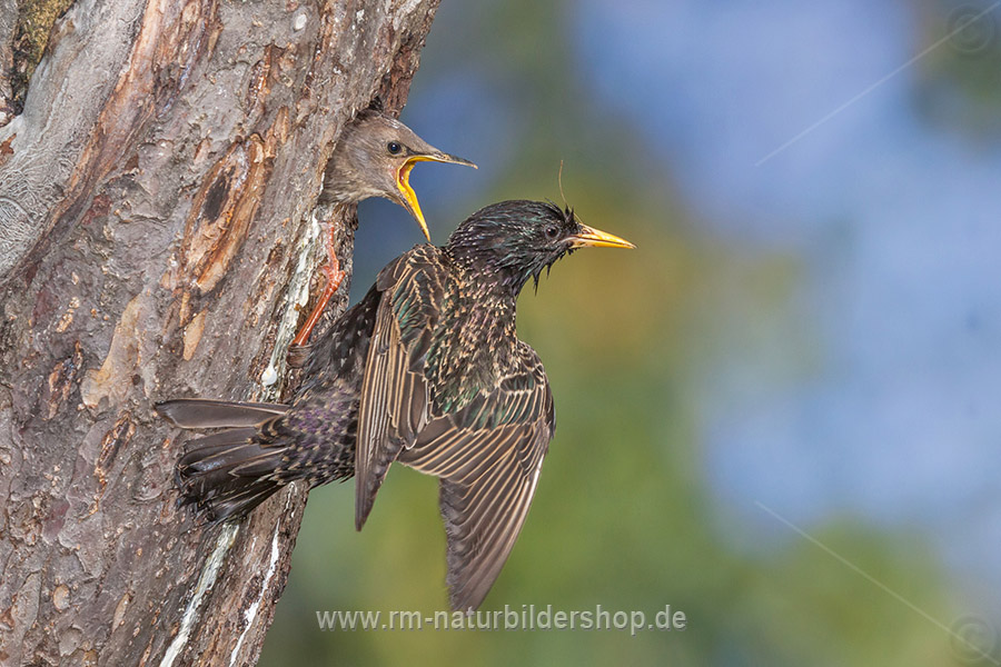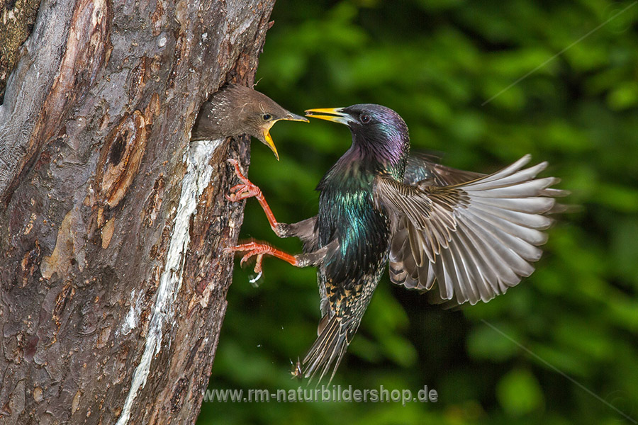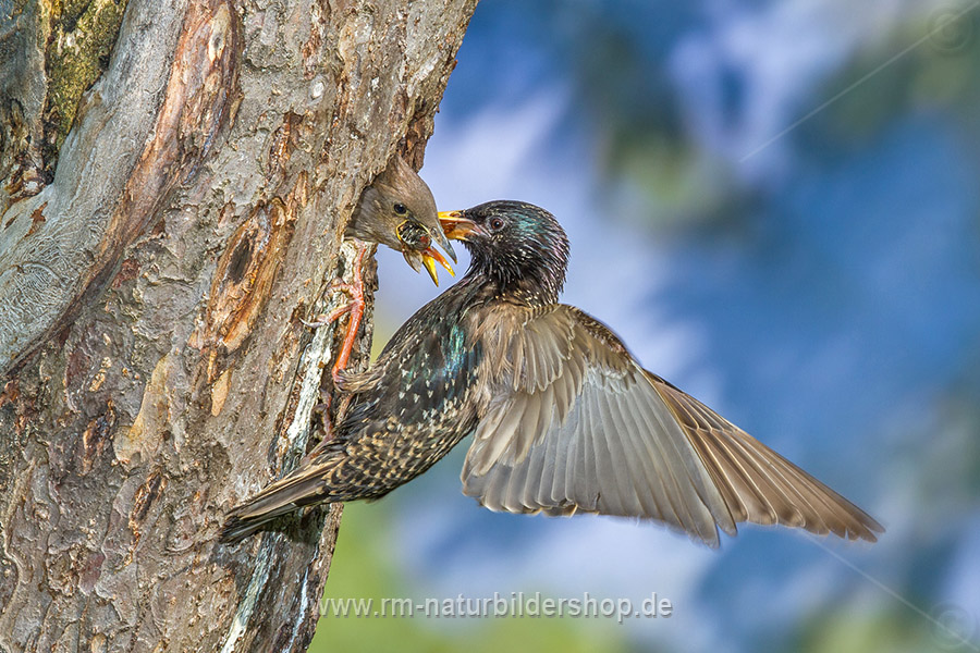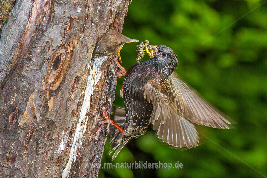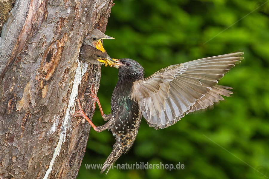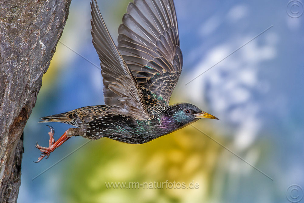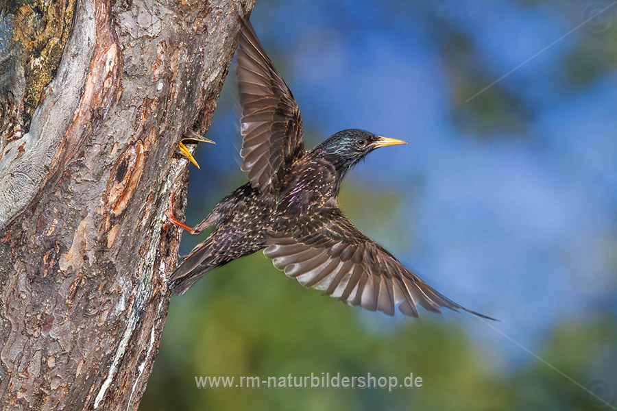 Star (Sturnus vulgaris) beim Abflug von der Höhle