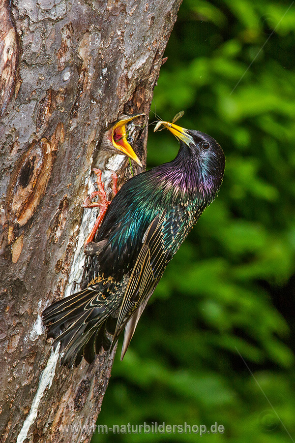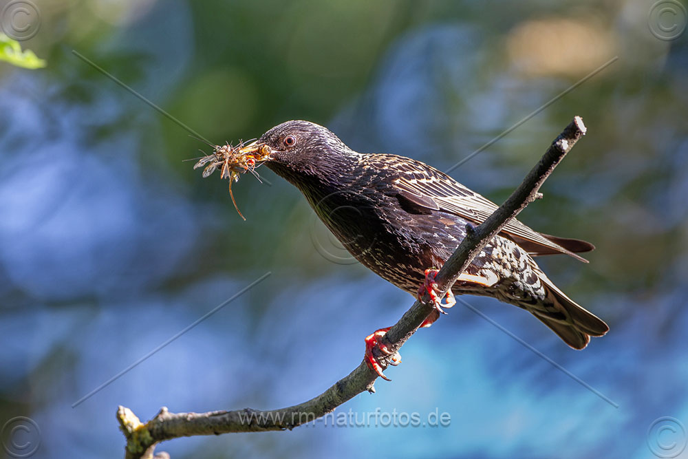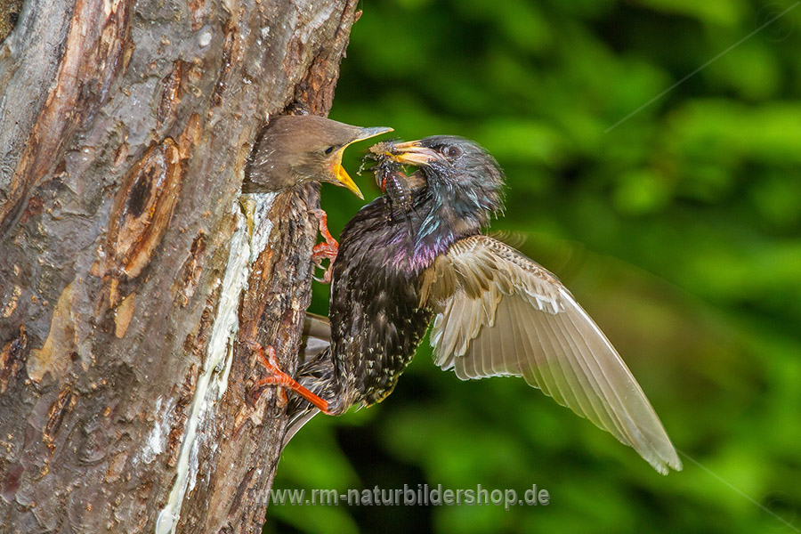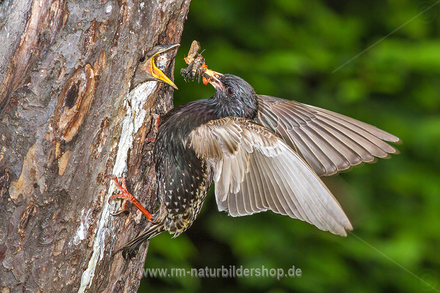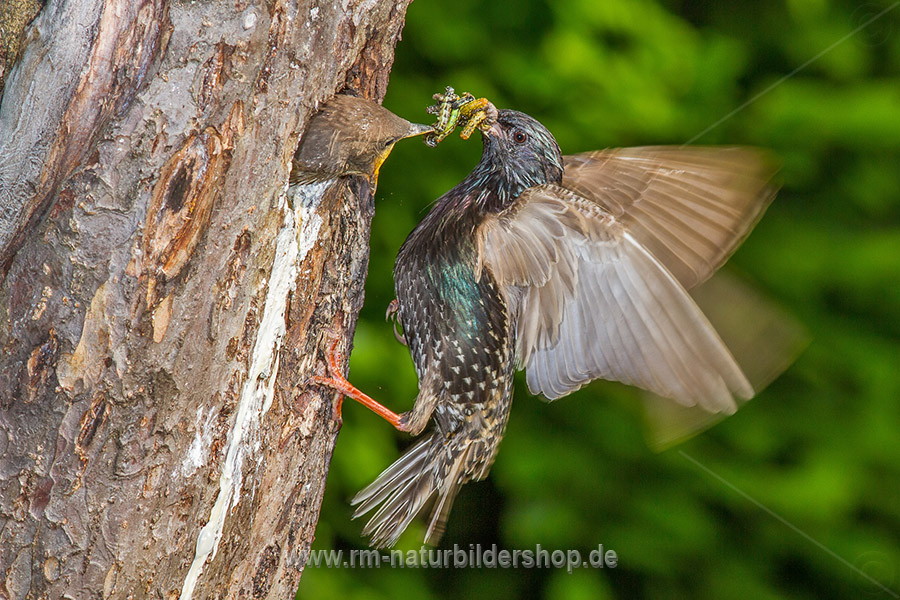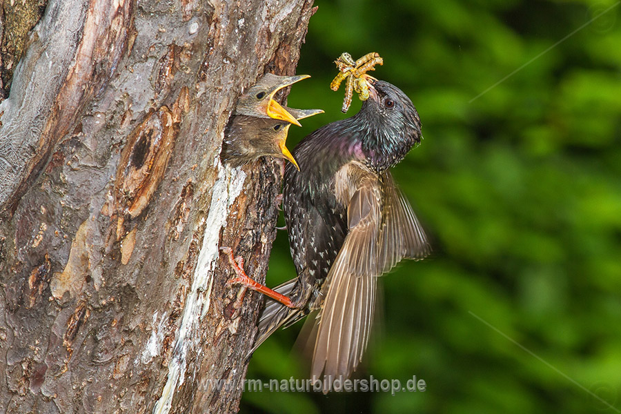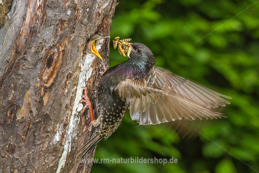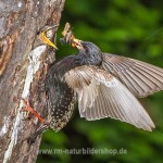 Star (Sturnus vulgaris) mit Futter für den Nachwuchs