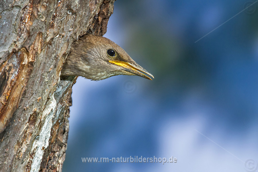 Star (Sturnus vulgaris) Jungvogel schaut aus der Höhle