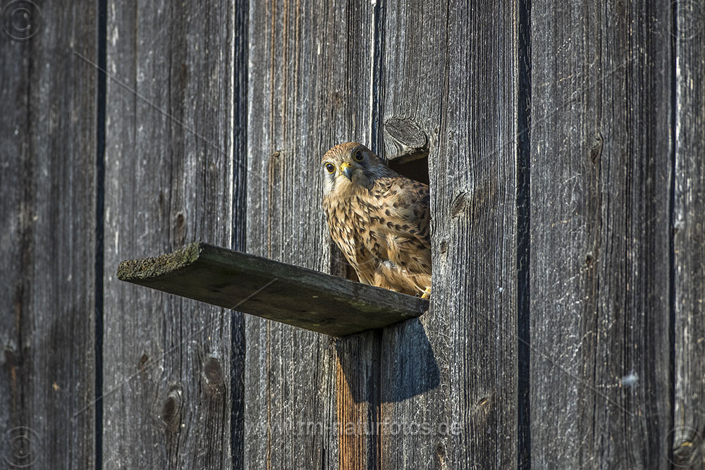 Turmfalke (Falco tinnunculus) Weibchen am Nistkasten - warten auf das Frühjahr